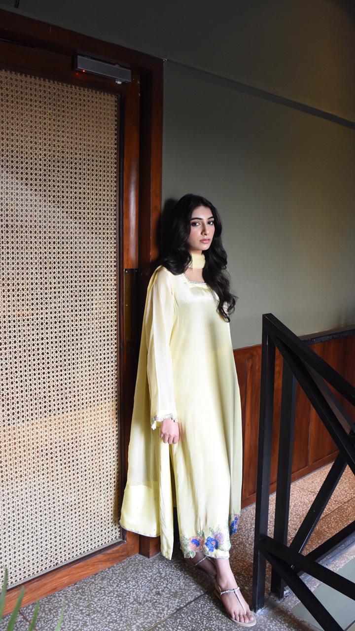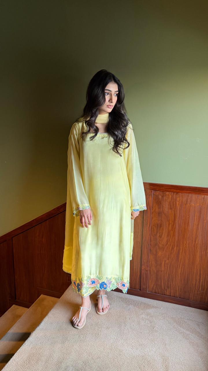The shirt hem, sleeves, and dupatta borders are entirely hand-worked with delicate sequins and beads, adding subtle sparkle and texture. An overall sequin spray enhances the dupatta, complemented by sequin detailing on the pant hem and along all four sides of the dupatta.