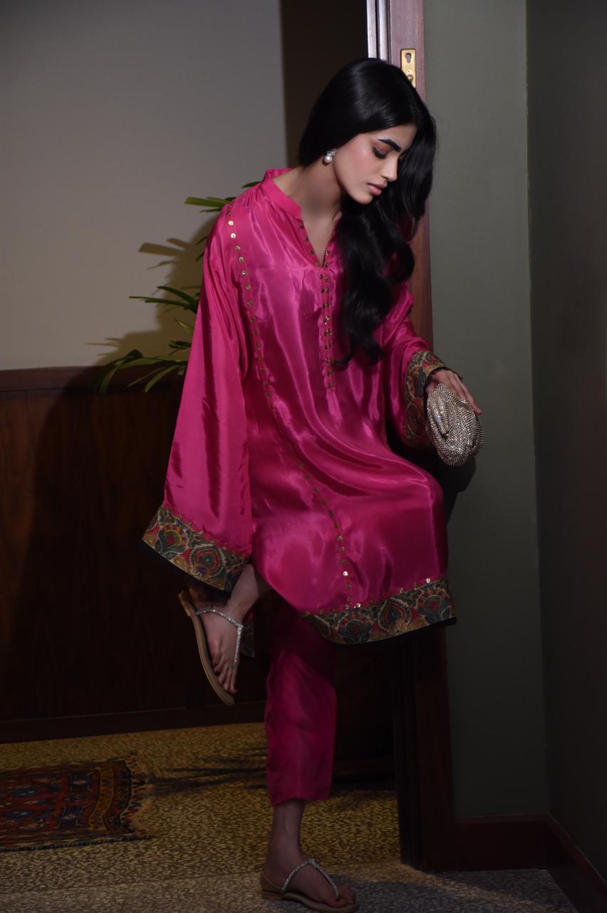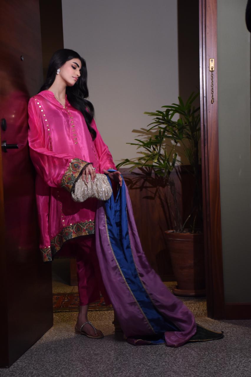 The shirt is finished with mukaish and kani borders running all around, adding depth and artisanal character to the silhouette. It can be paired with a tri-coloured dupatta featuring refined gota detailing.