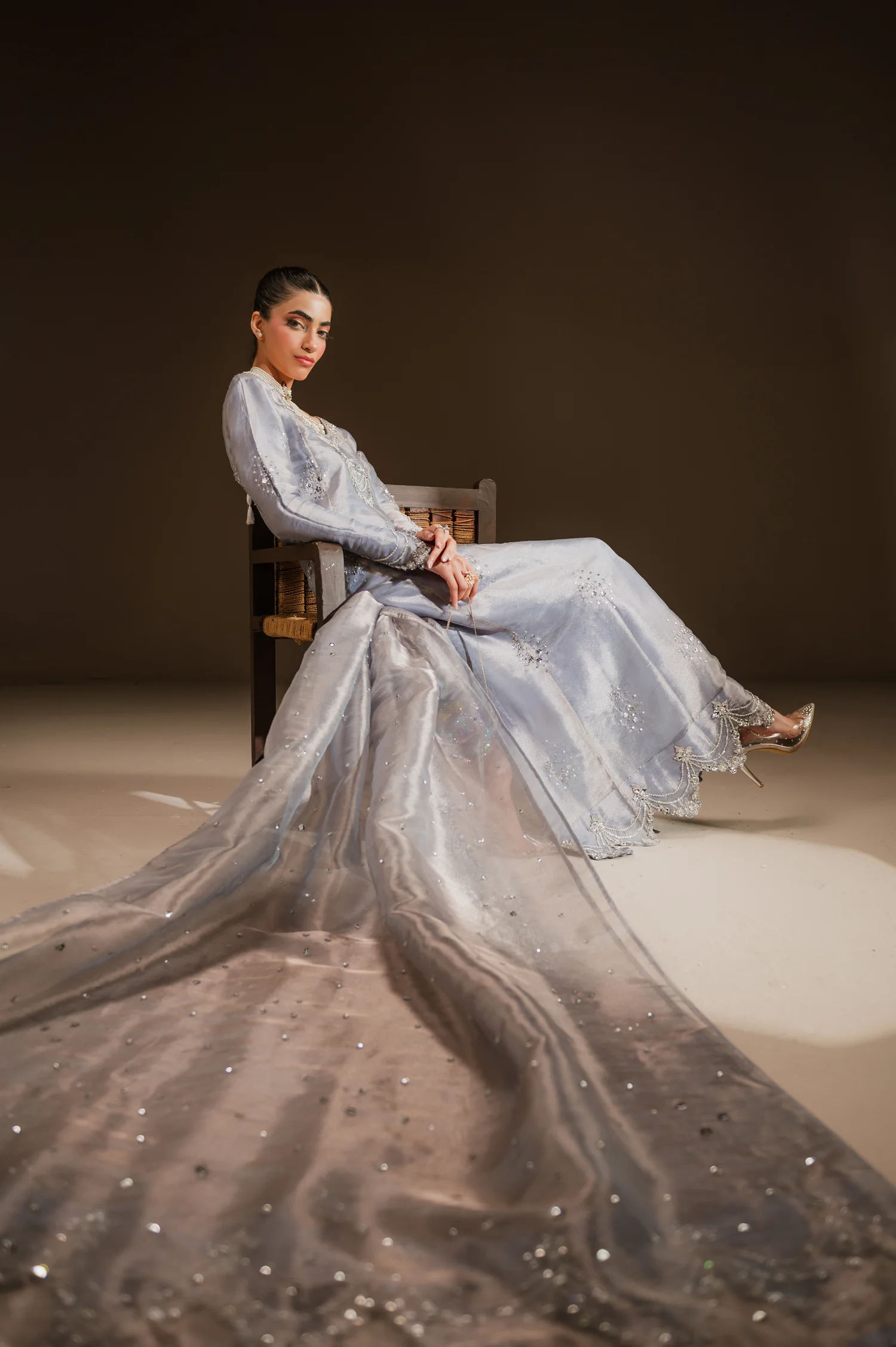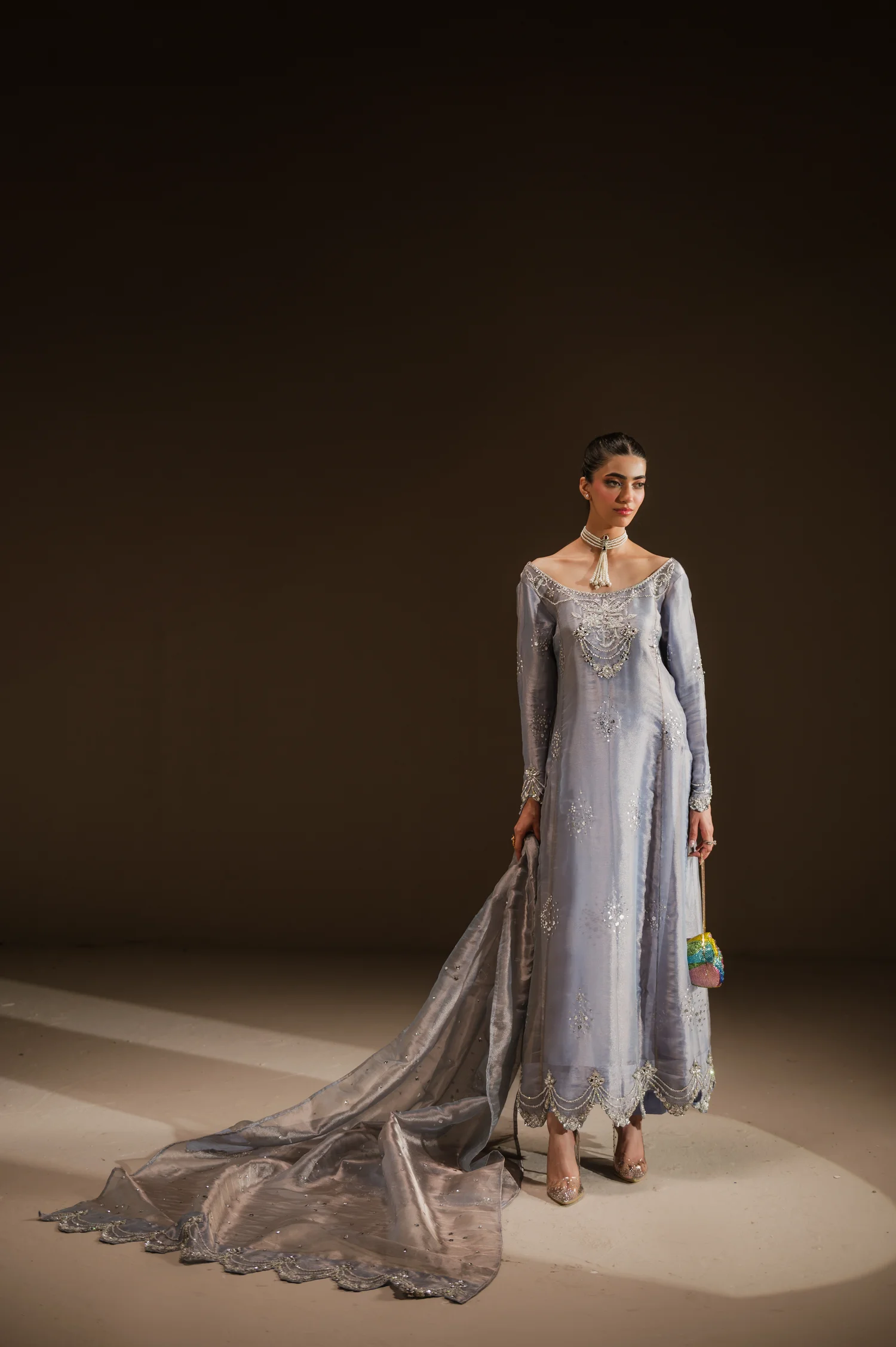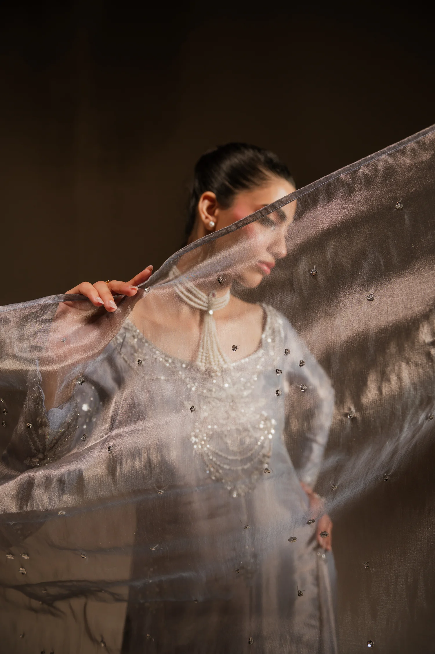 A paneled masterpiece in pure tissue, this set exudes timeless glamour. The kameez, trousers, and dupatta are brought to life with meticulous handwork in sequins and swarovski crystals, creating a radiant sparkle with every movement. Â