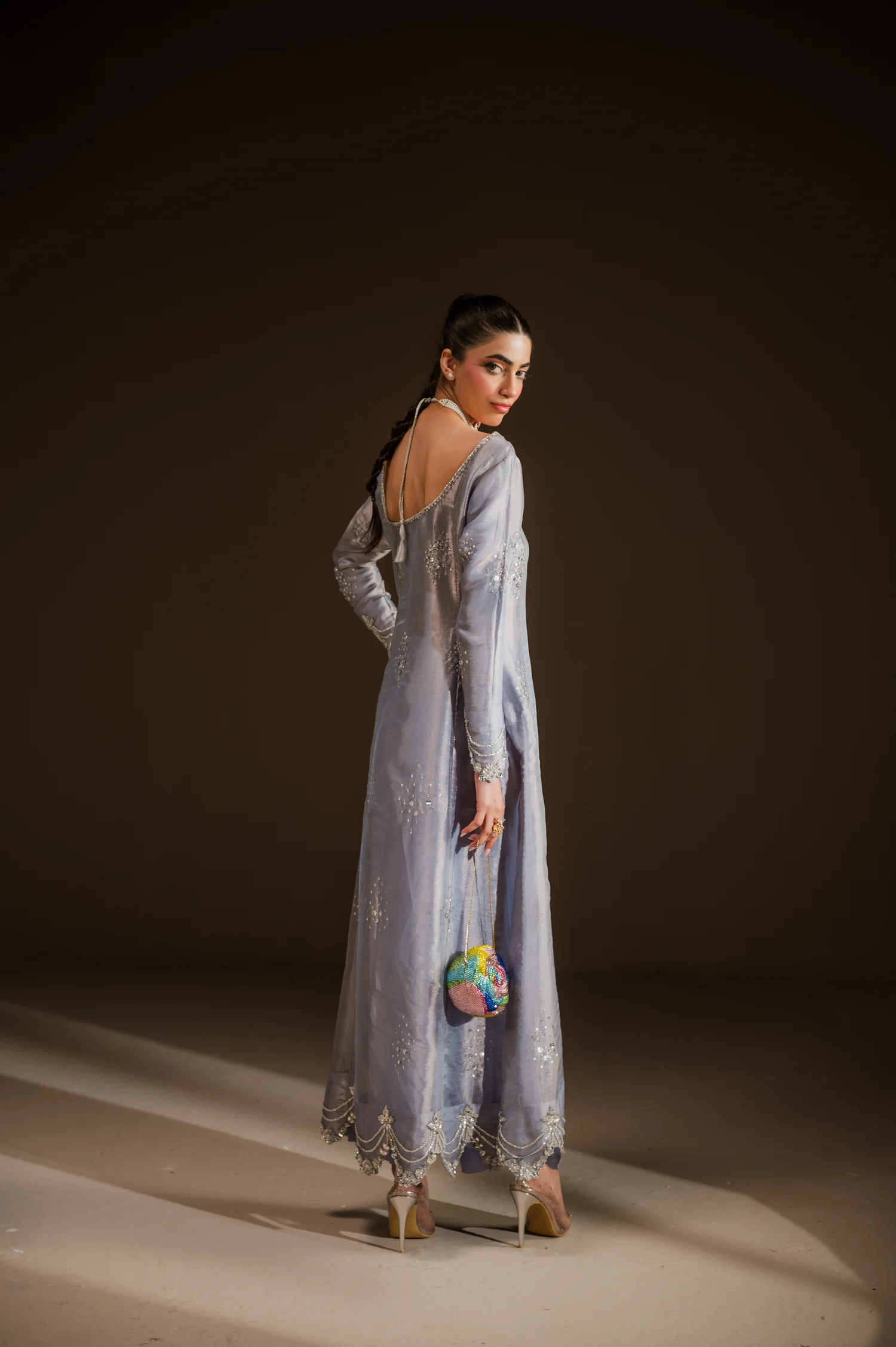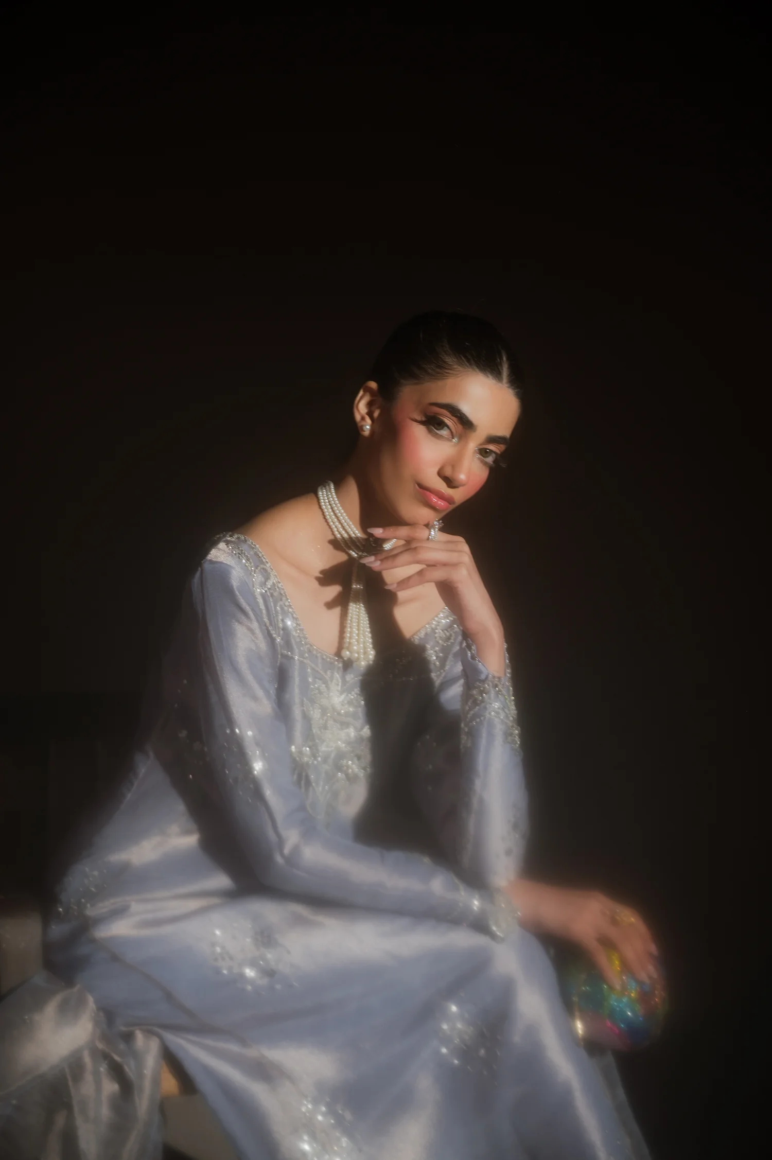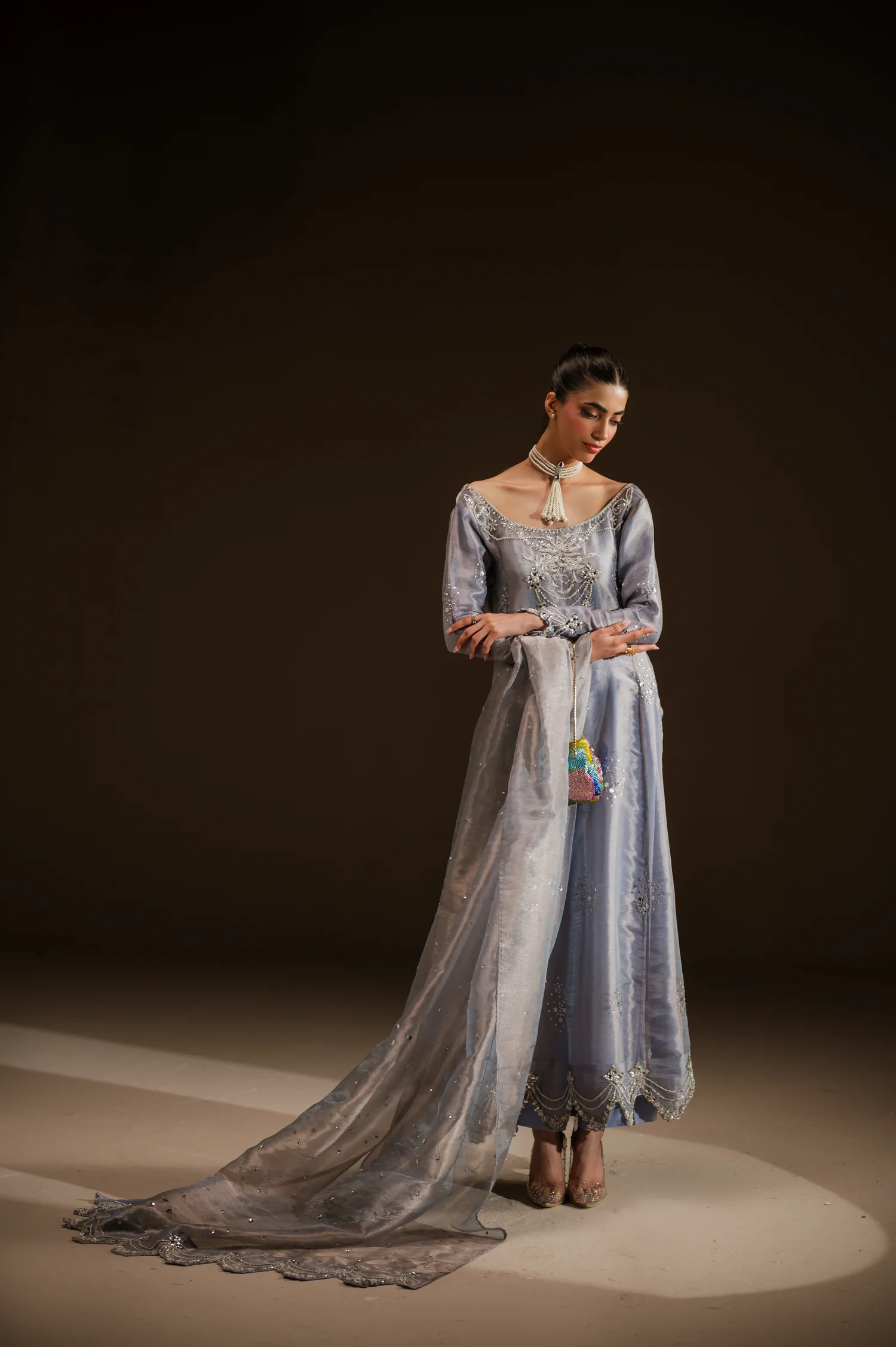 A paneled masterpiece in pure tissue, this set exudes timeless glamour. The kameez, trousers, and dupatta are brought to life with meticulous handwork in sequins and swarovski crystals, creating a radiant sparkle with every movement. Â