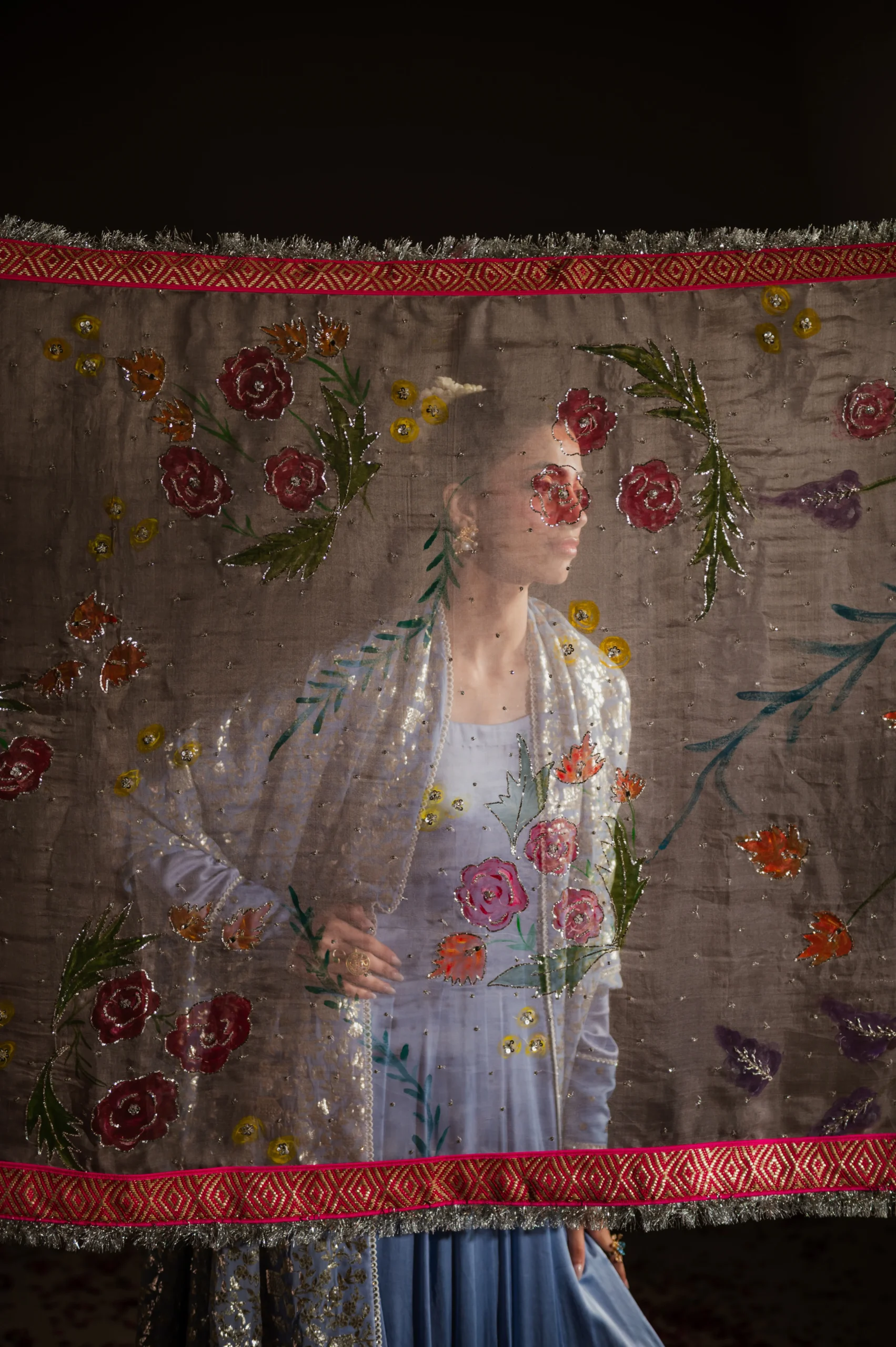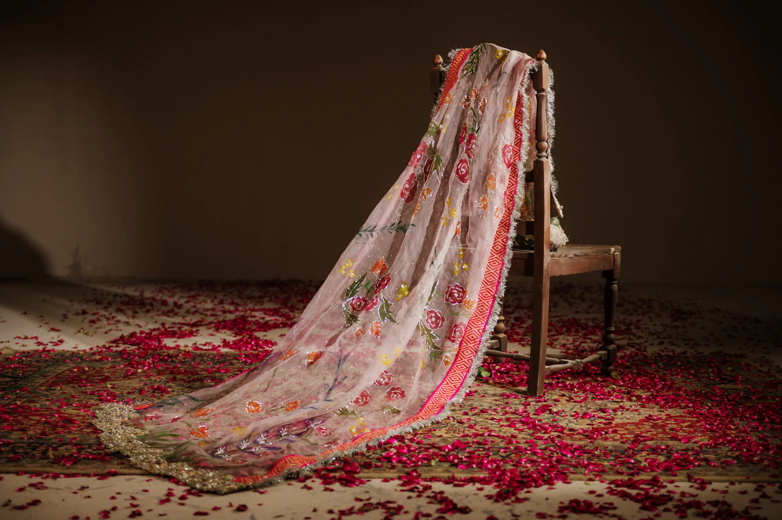 A true collector’s piece, this pure organza dupatta is hand-painted by The Dot maestro herself, making each creation one-of-a-kind. The artistry is elevated with sleek adda work borders and striking accents, perfectly complementing the delicate brushwork. The fabric comes alive with all-over pittawork and sequins, adding that unmistakable signature Dot drama, a hand-painted dream designed to be treasured.