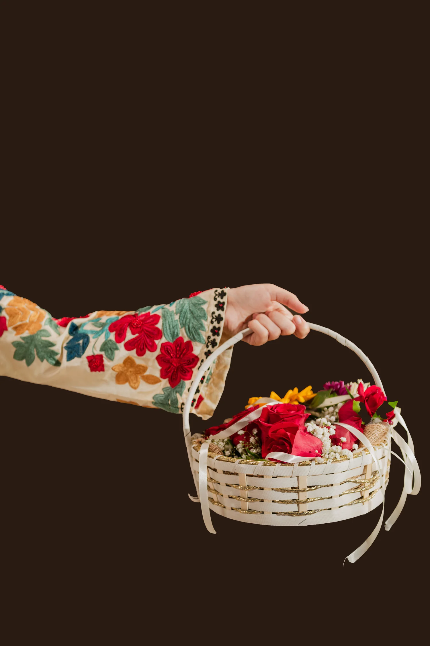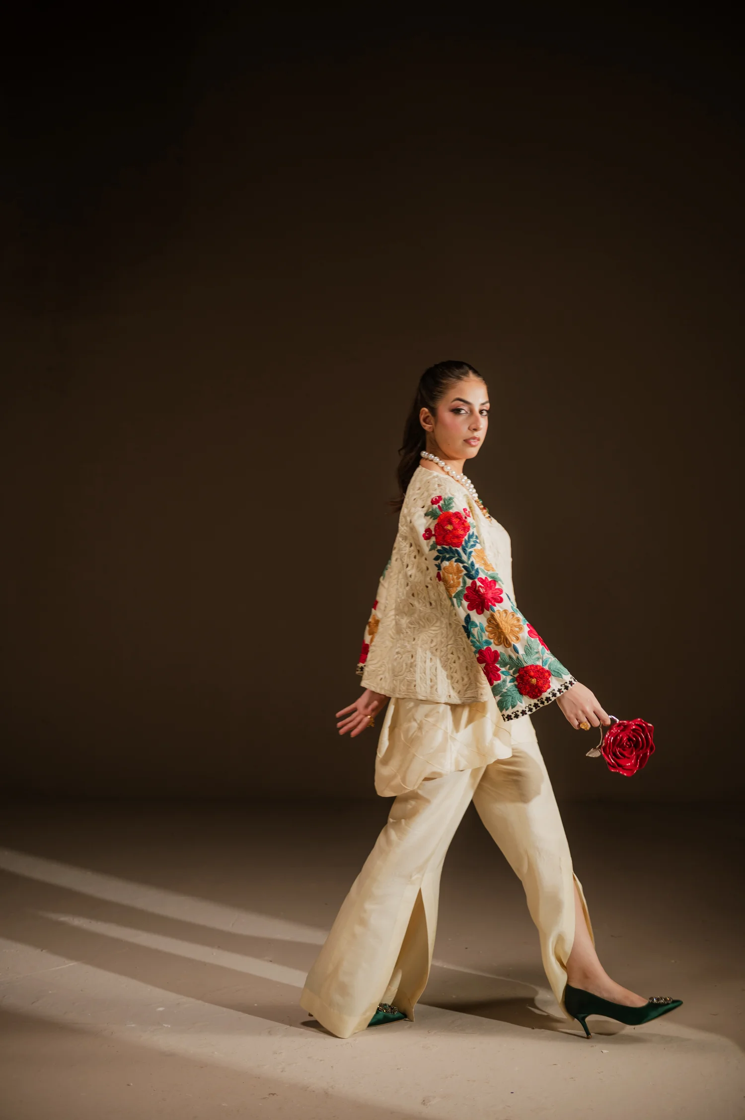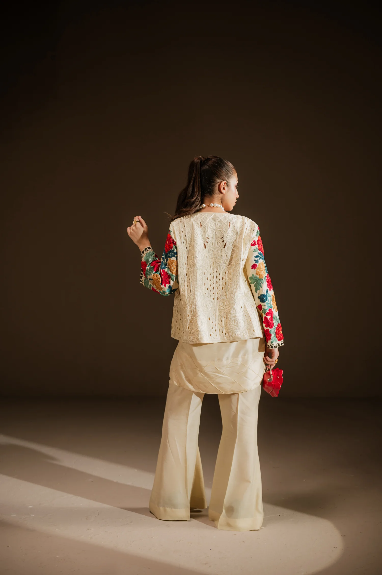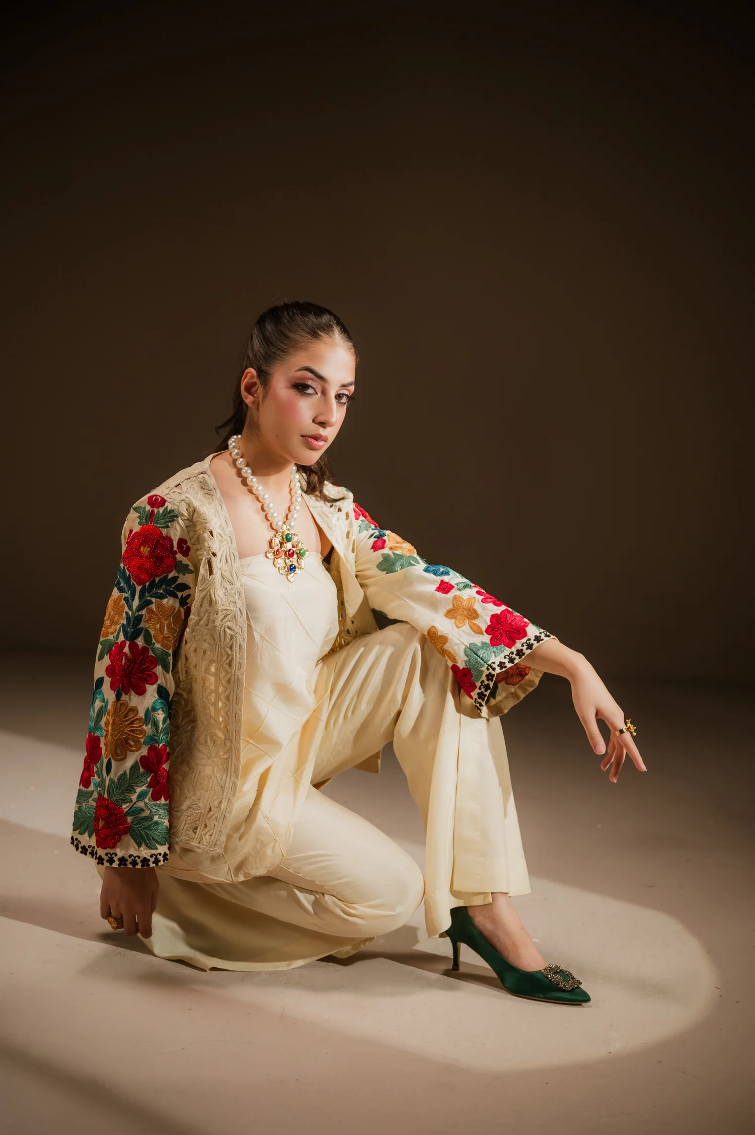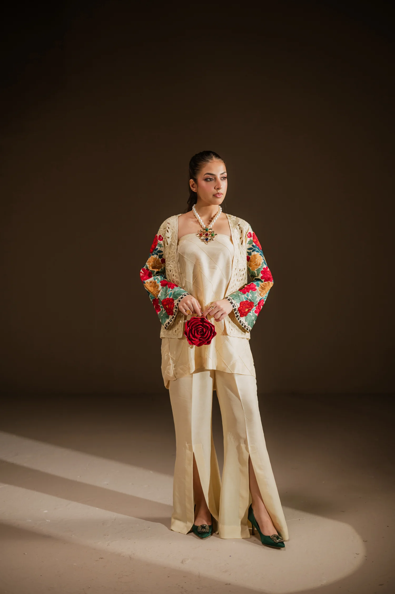 The look begins with a pleated inner crafted in raw silk, offering a subtle play of texture and structure. It is paired with tailored pants featuring a sleek slit-open design, striking the perfect balance between modernity and tradition. The highlight of the set is the handworked raw silk jacket, adorned with all-over embroidery, intricate cutwork, and 3D embellishments, bringing depth and artistry to every inch.Jacket + InnerÂ