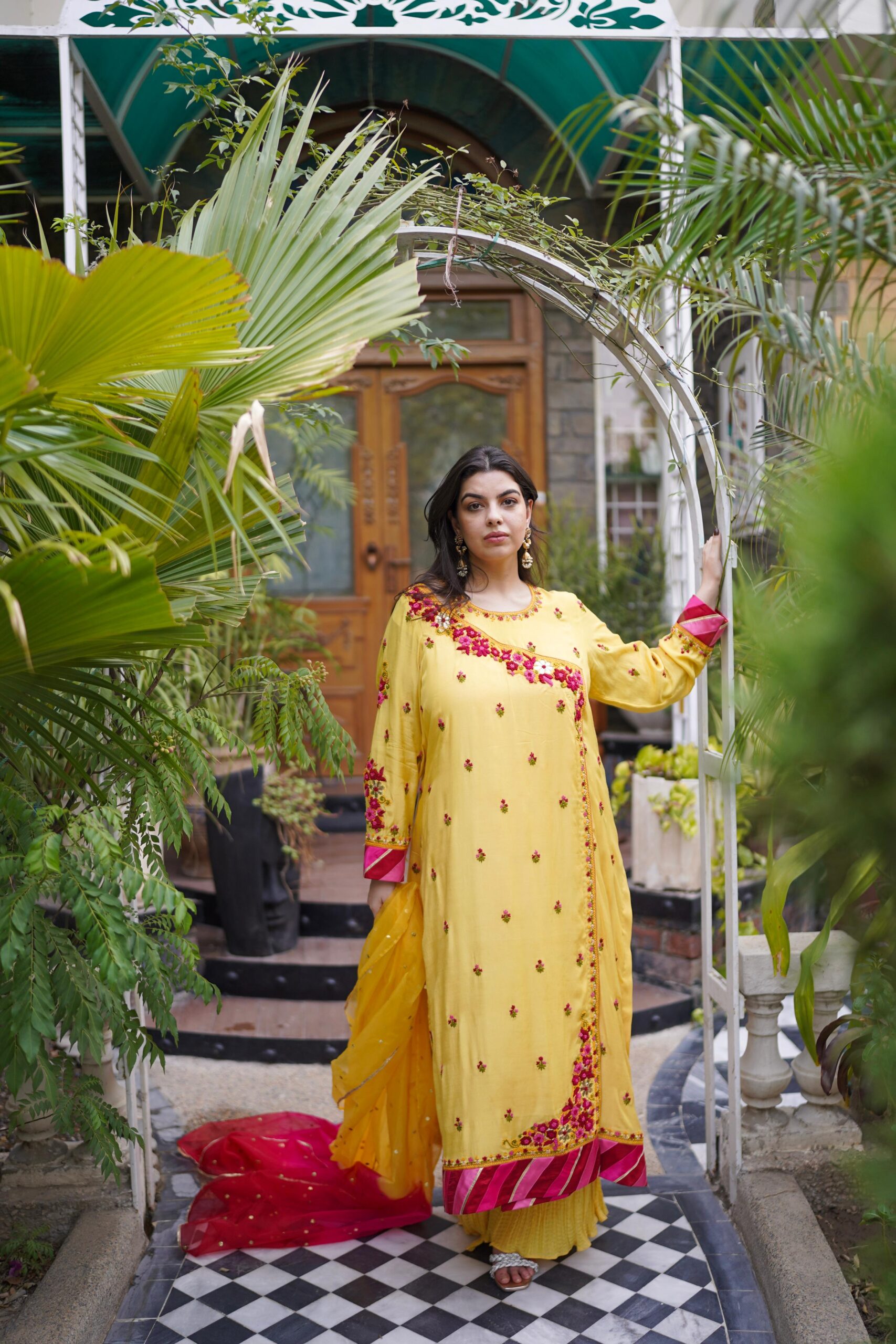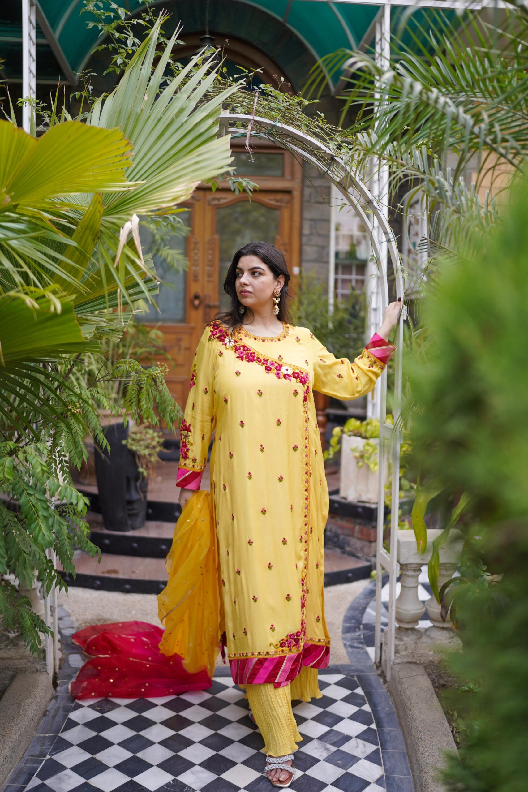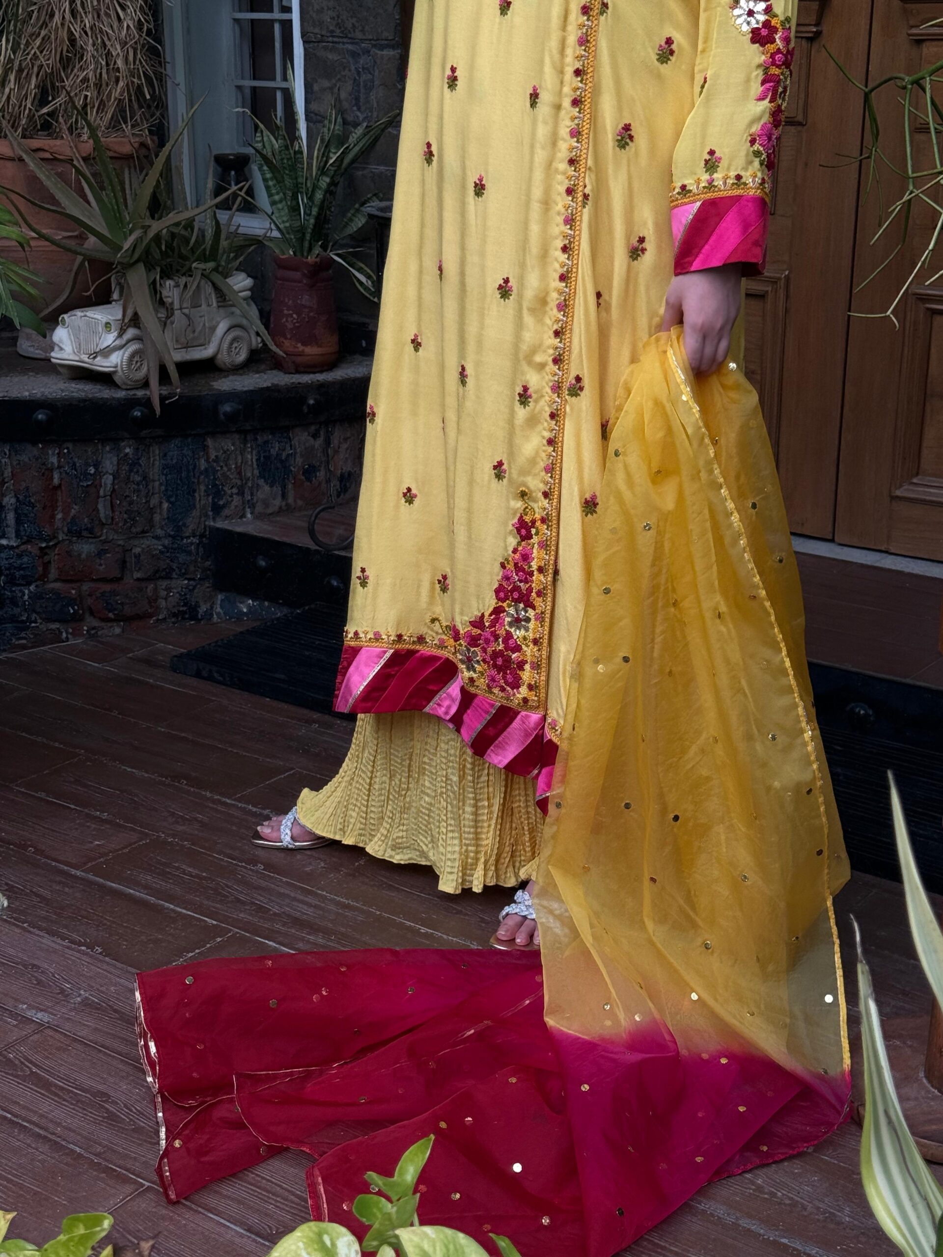 A timeless 3-piece masterpiece in pure summer silk, the Bahaar Angrakha is a celebration of heritage and handcraft. The shirt alone features intricate hand-knotted embroidery and delicate mukaish work across the front, back, and sleeves, making it a work of art in motion. Paired with a 3-yard mukaish dupatta in three stunning shades, finished with delicate gota accents, and a beautifully crushed 6-yard trouser that flows with grace, this ensemble blends tradition with understated luxury.