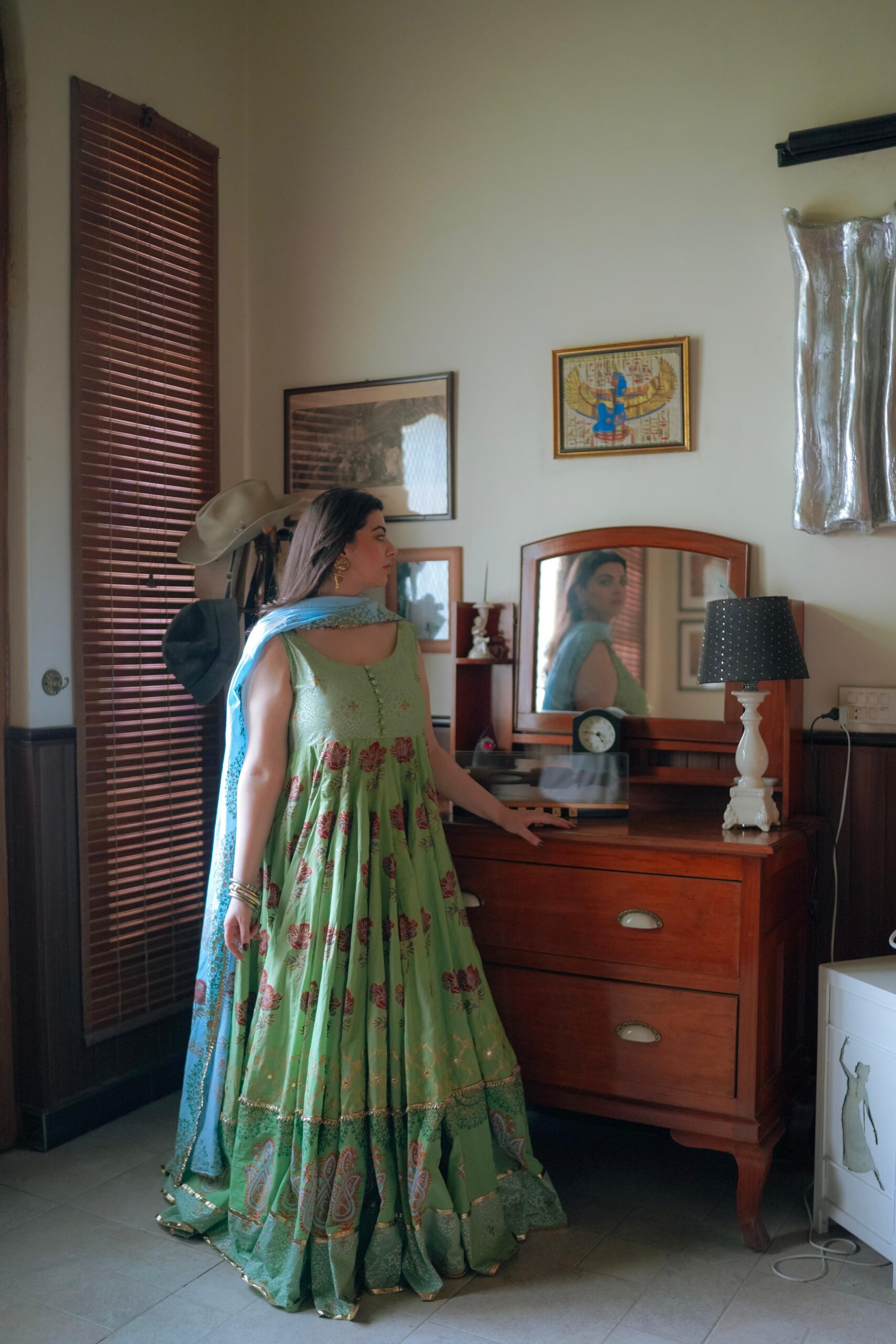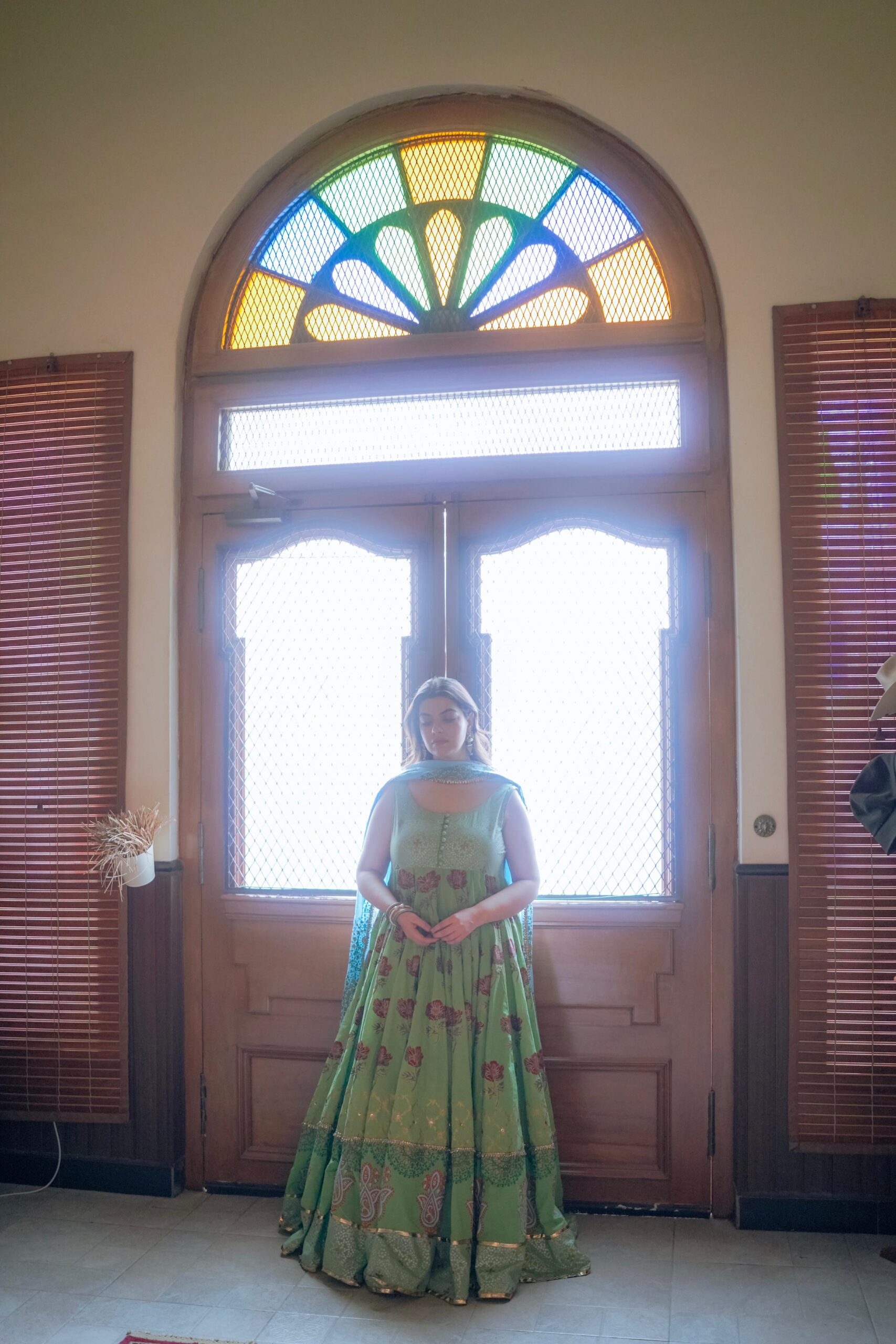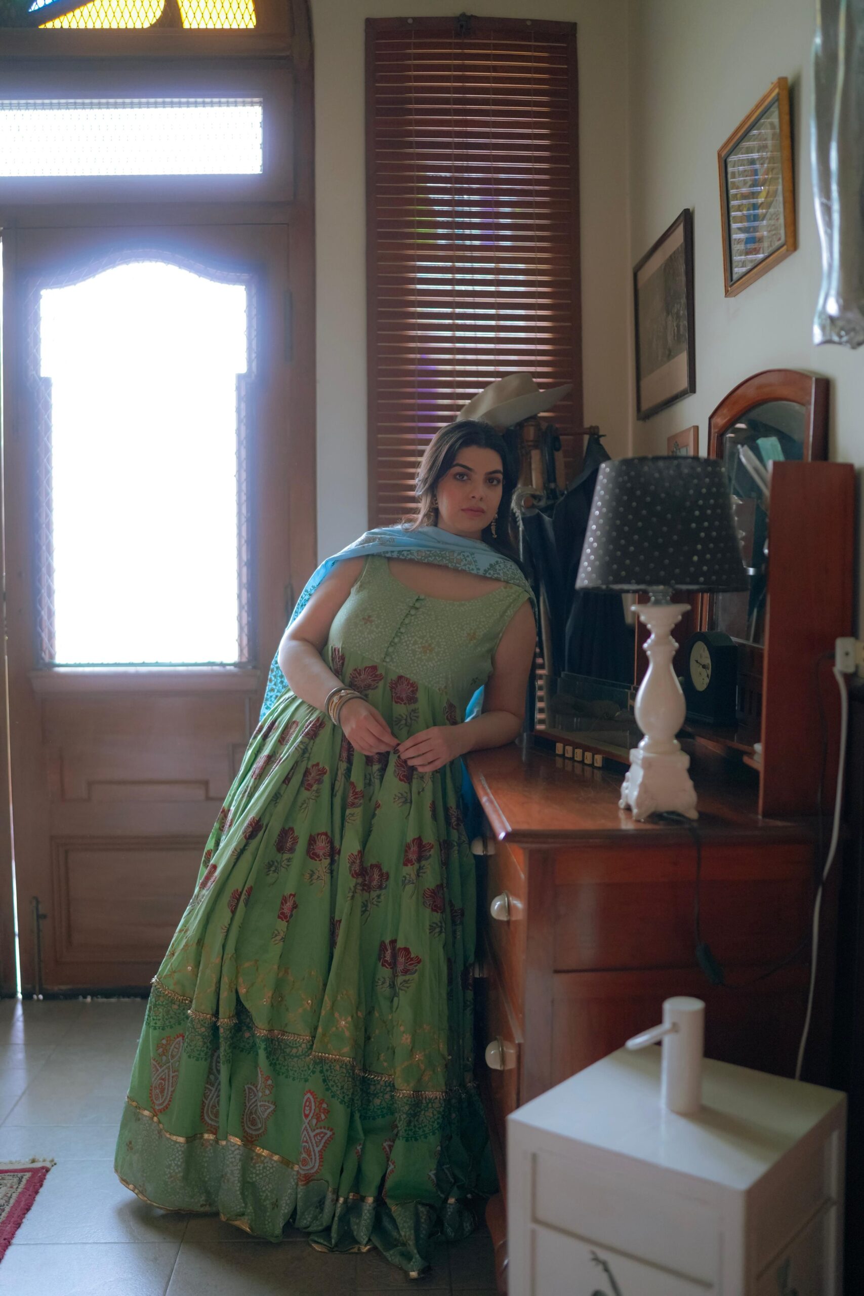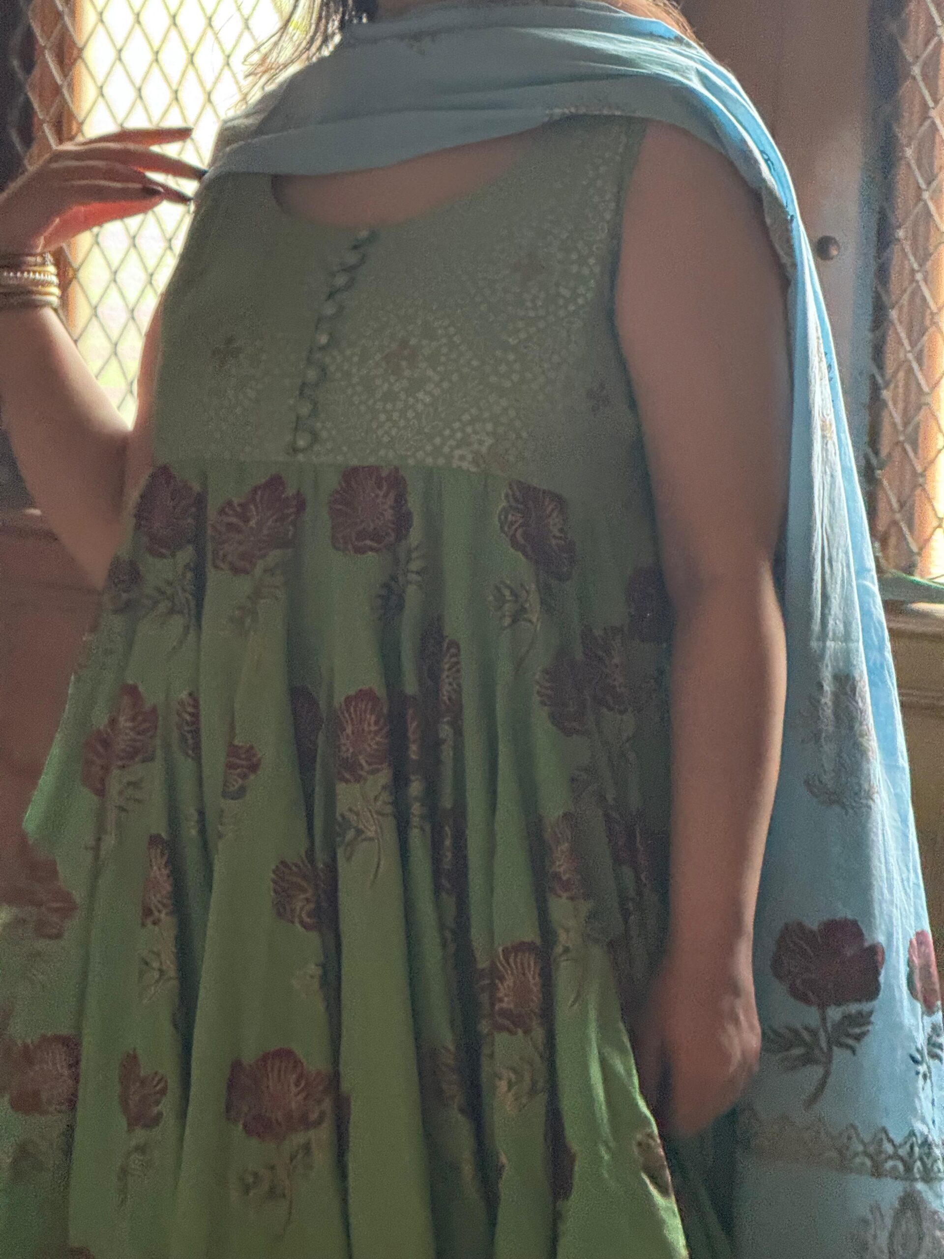 A regal two-piece kalidar crafted from nearly 30 yards of fabric, featuring 100 finely cut kalis that bloom into a breathtaking 22 meters plus flare. It has sitara and gotta work on it along with foiled block print details and cushioned buttons. The dupatta is 3.5 yards of lawn, fully block printed and embellished with gotta work along the borders. The outfit is available in both medium silk and lawn in the same price, it is a true celebration of movement, craftsmanship, and timeless tradition.