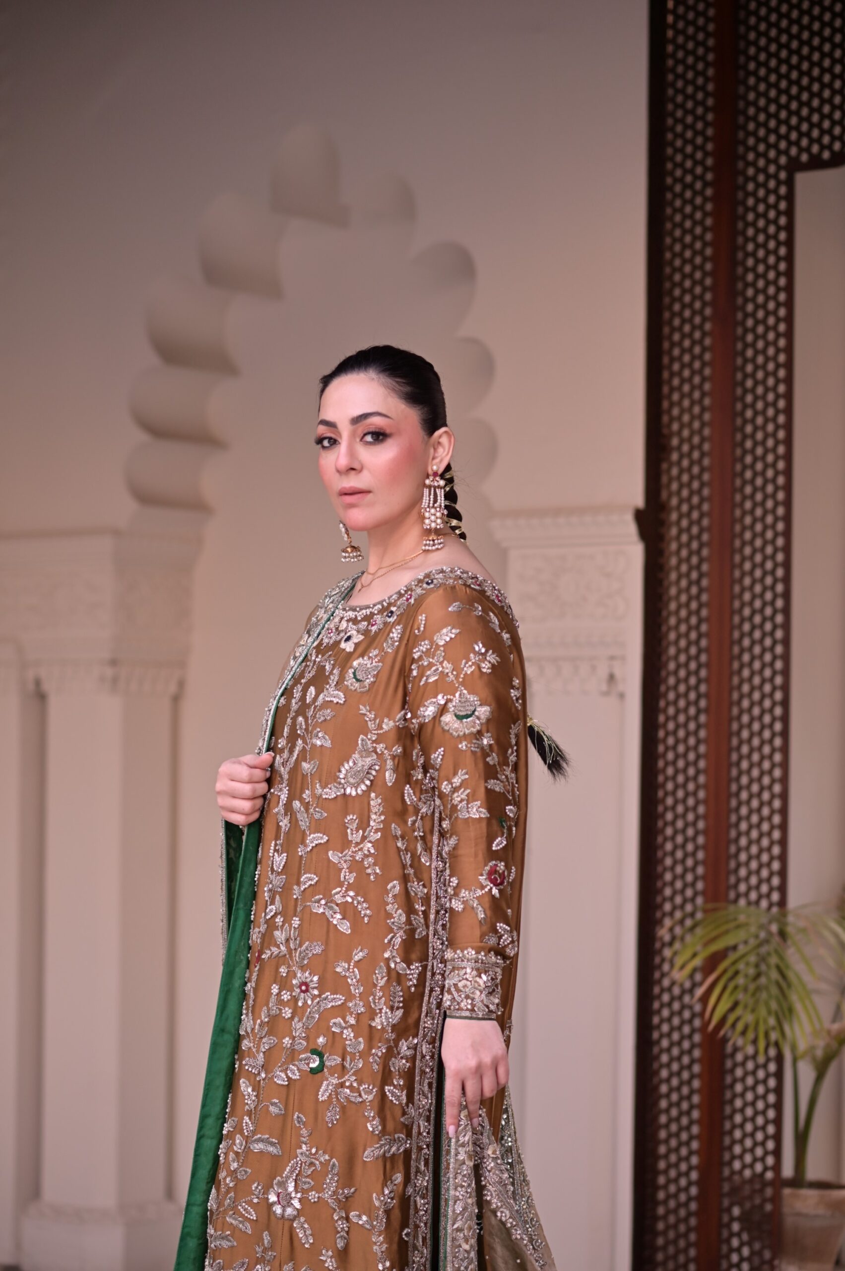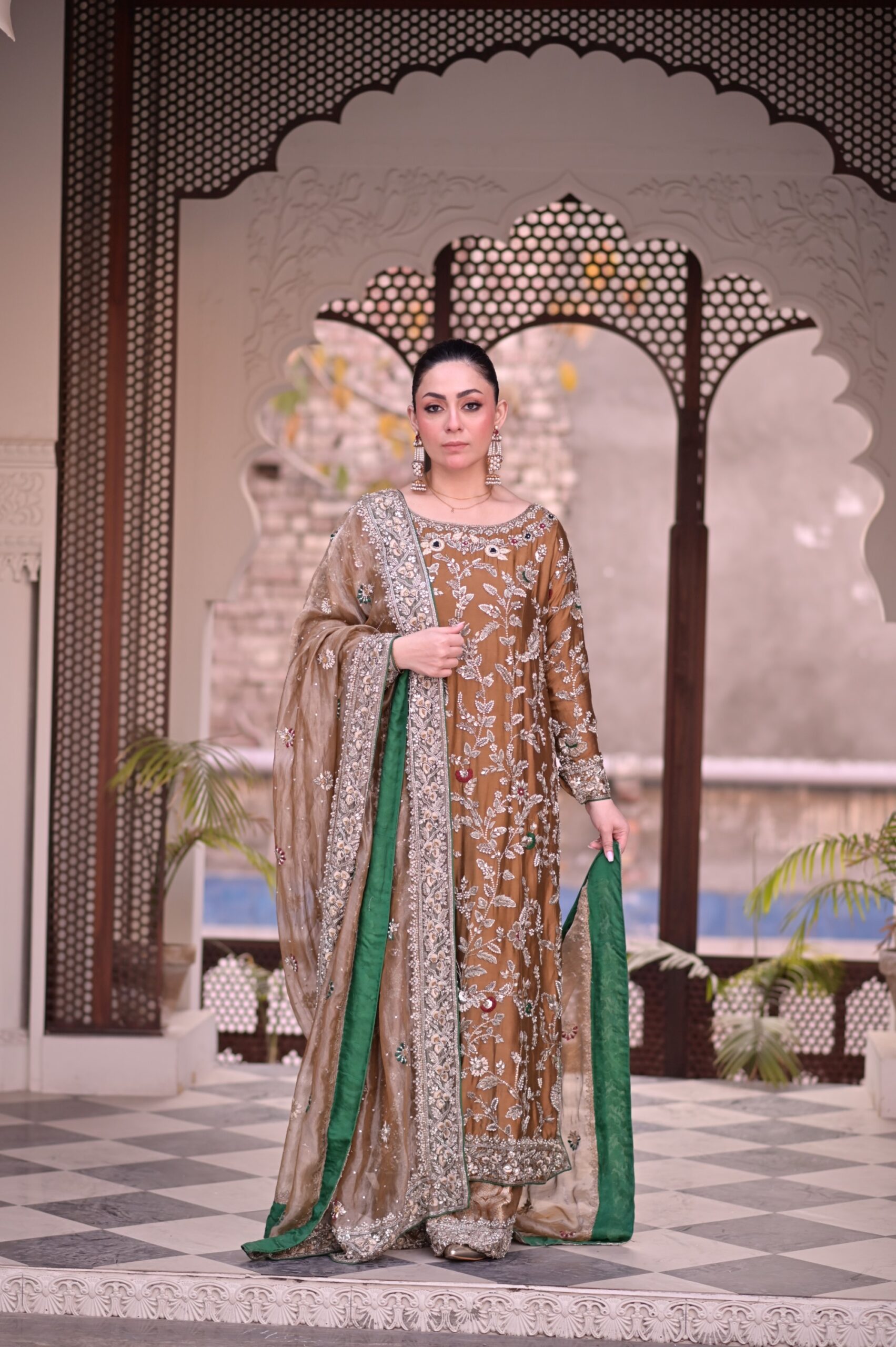 Our take on the classic Mughal era through this old-fashioned kameez and azaar. A blend of tissues and khamkhaab with heavy solid addawork all over the shirt, dupata, and trouser.