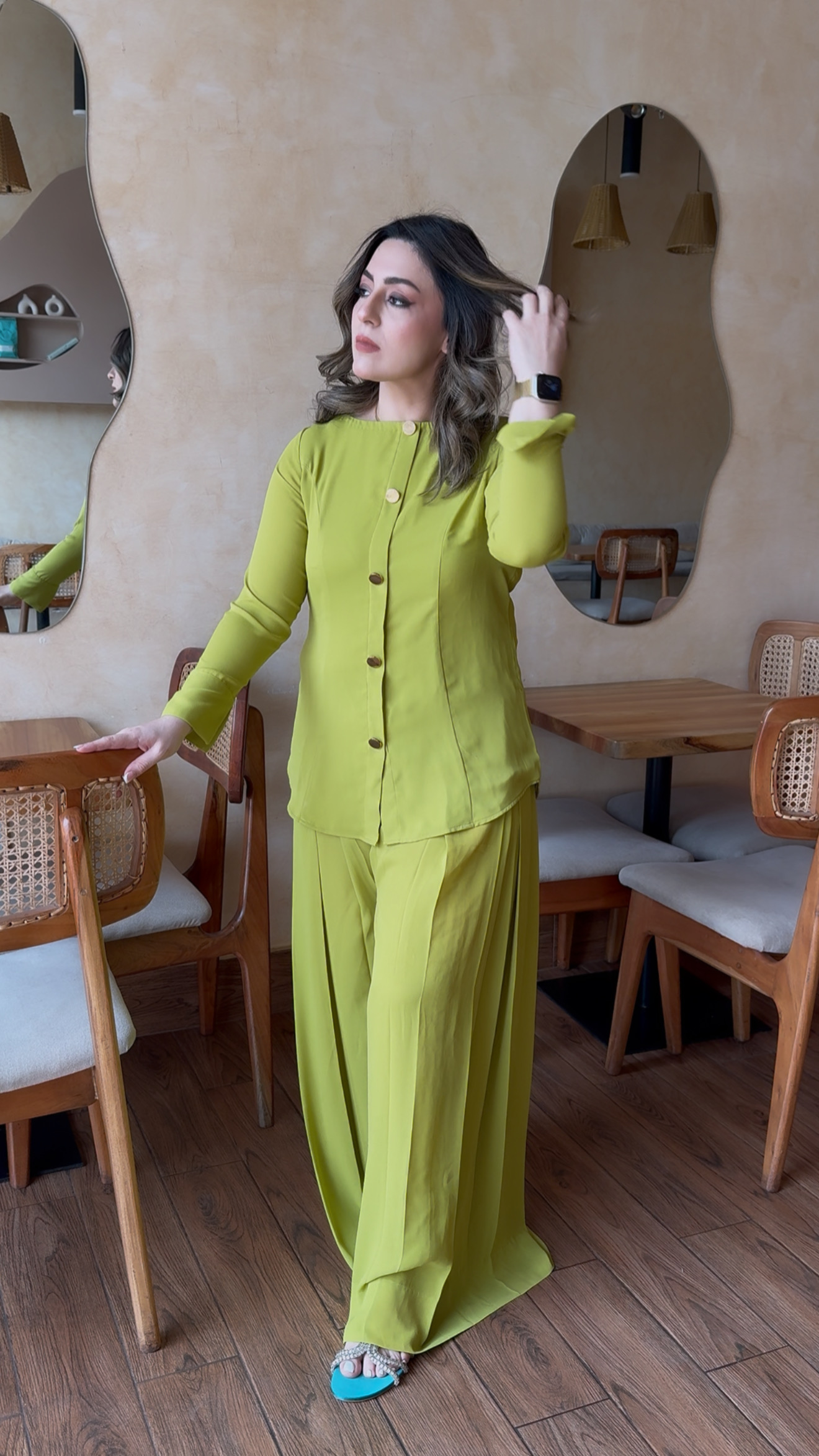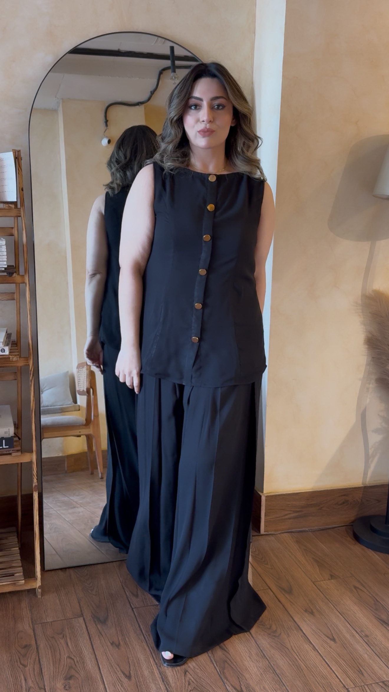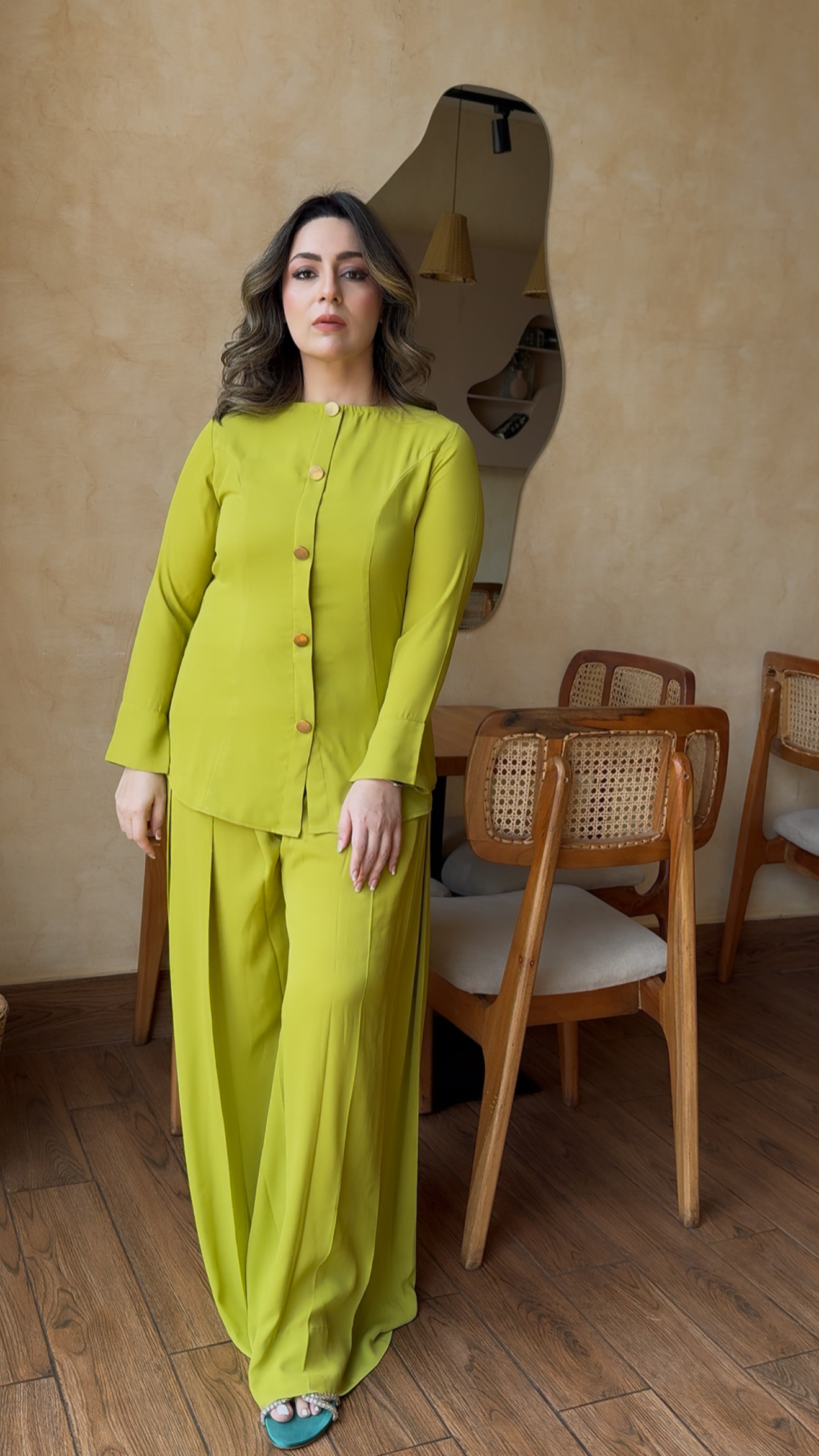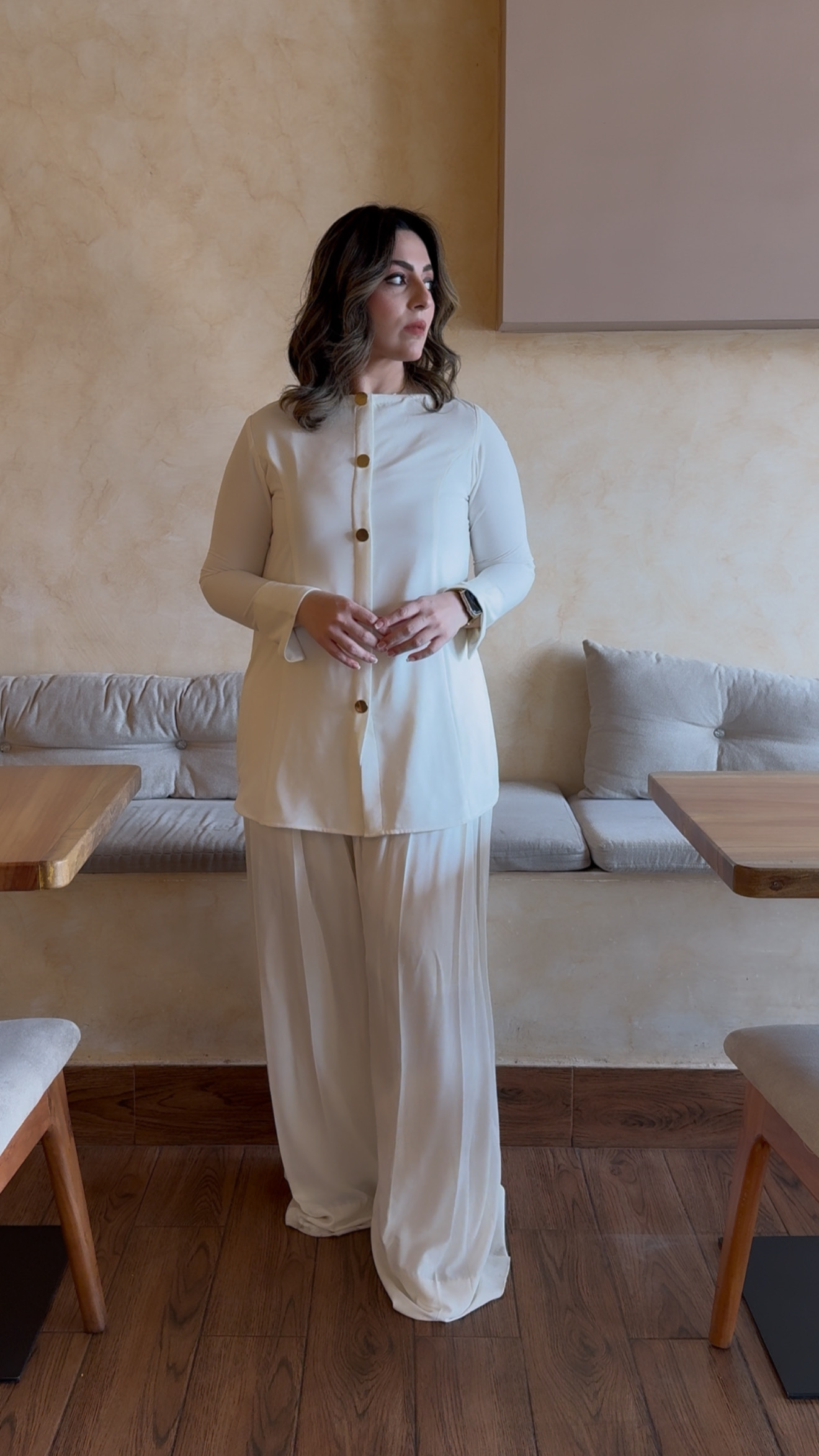 The material is cream crepe made with yards of fabric and lined to prevent being see through. Elegant dress darts added both from the front and back for that Boss look, finished with dull gold buttons. Paired with pleated high-waisted western pants to seal that deal.