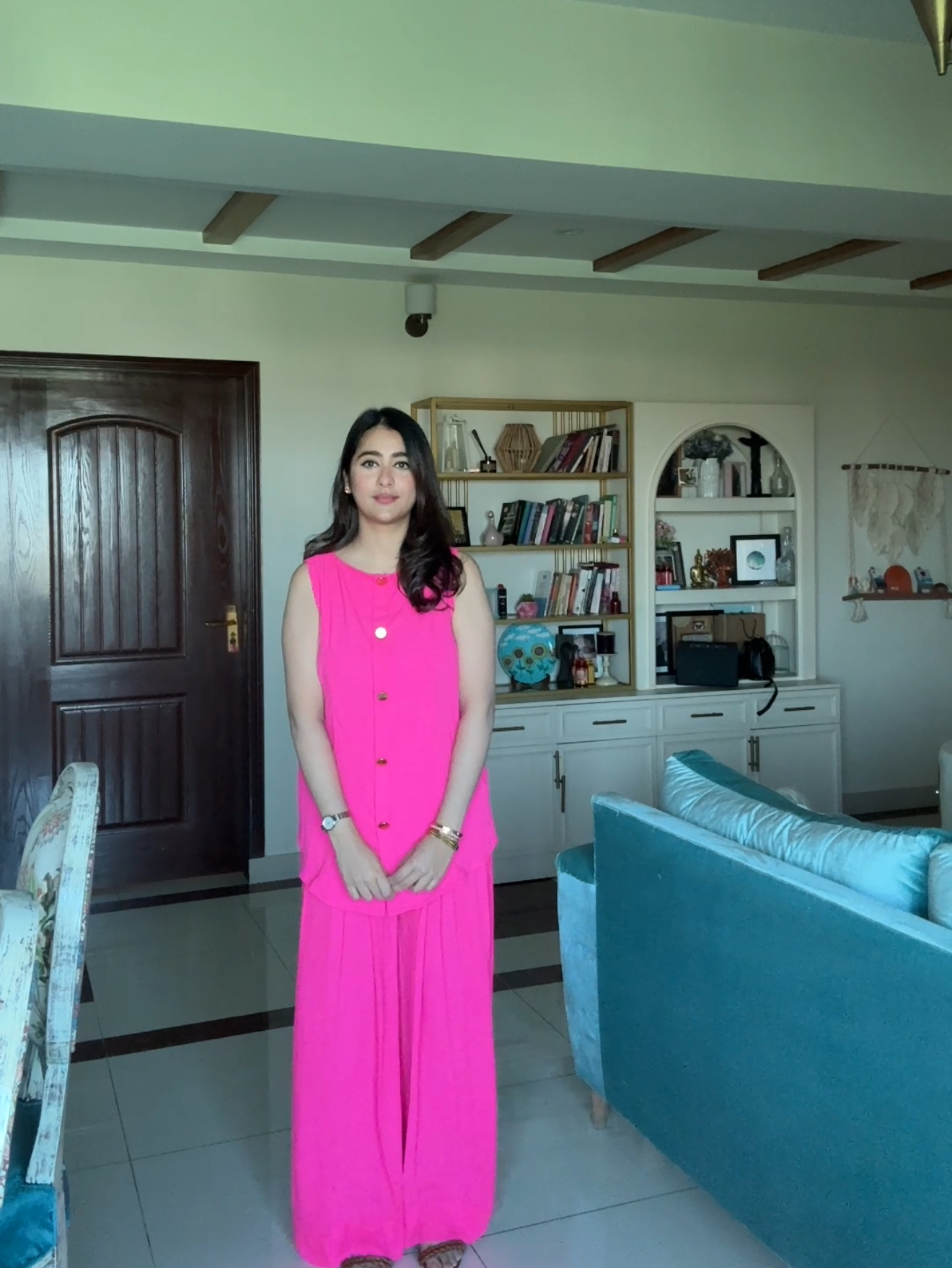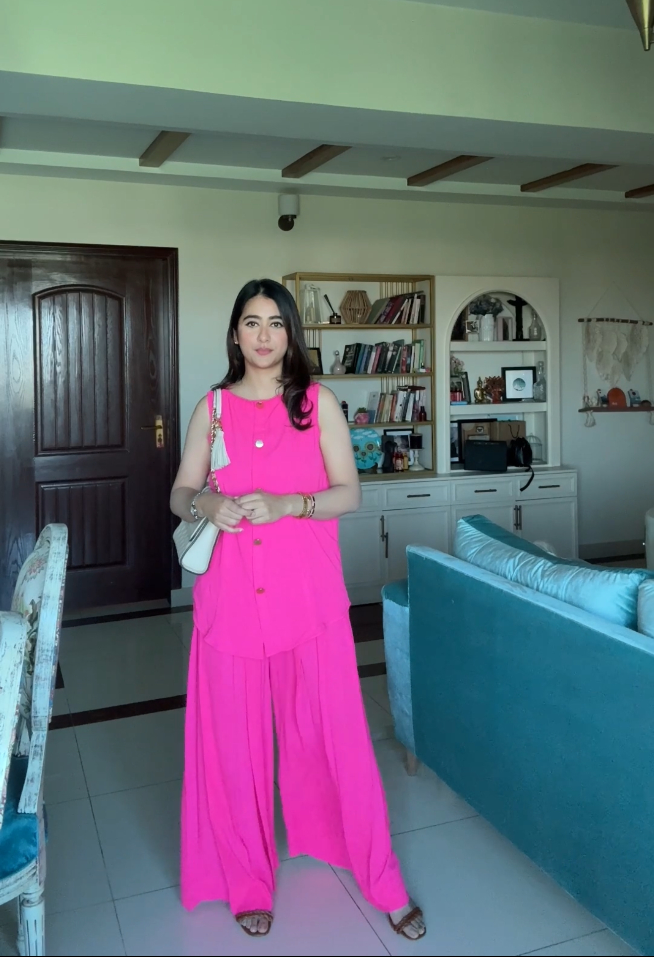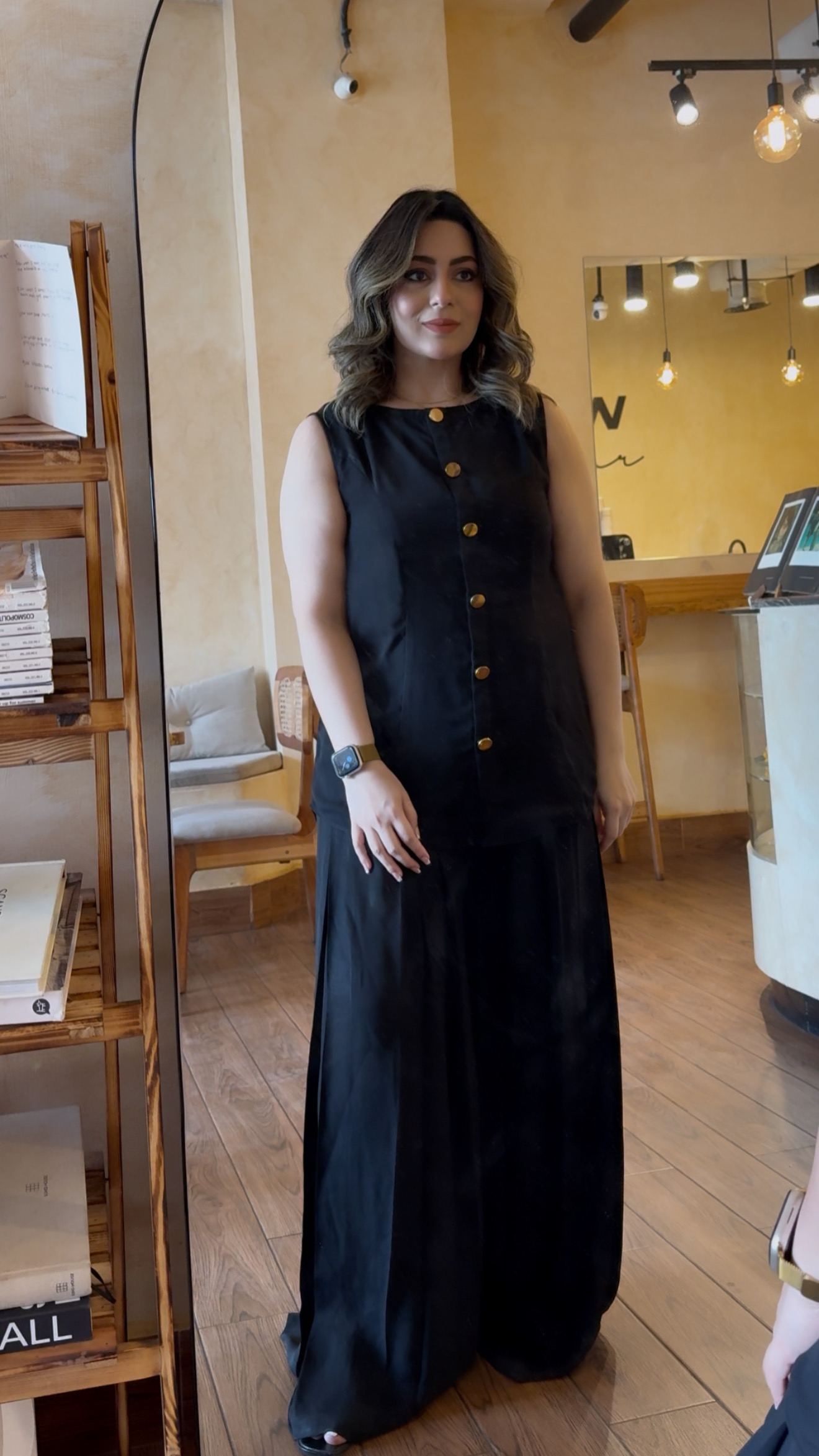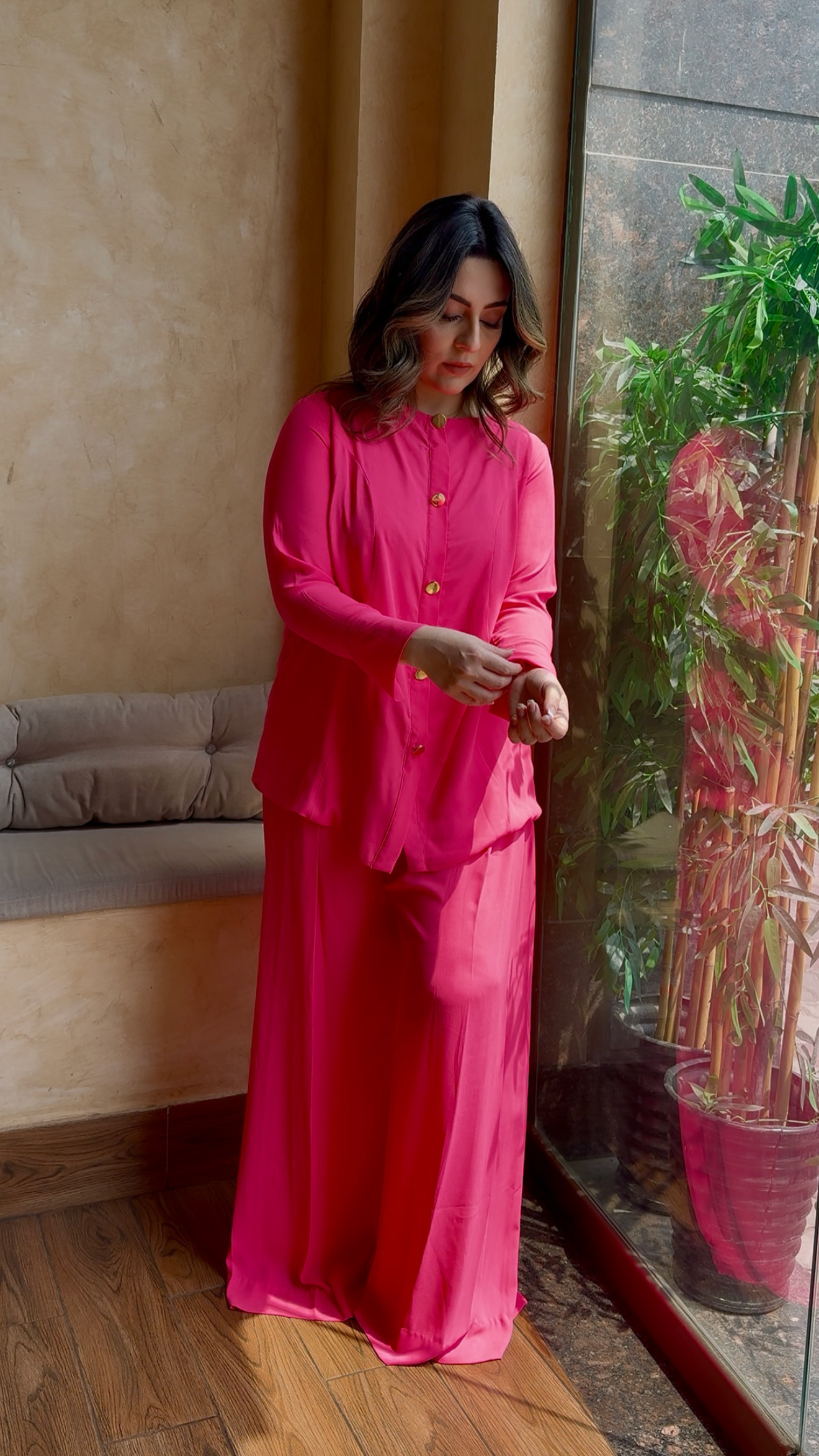 The material is cream crepe made with yards of fabric and lined to prevent being see through. Elegant dress darts added both from the front and back for that Boss look, finished with dull gold buttons. Paired with pleated high-waisted western pants to seal that deal.