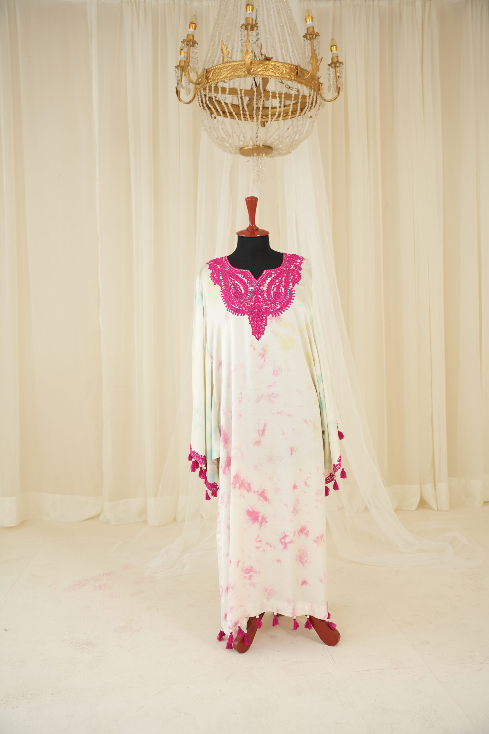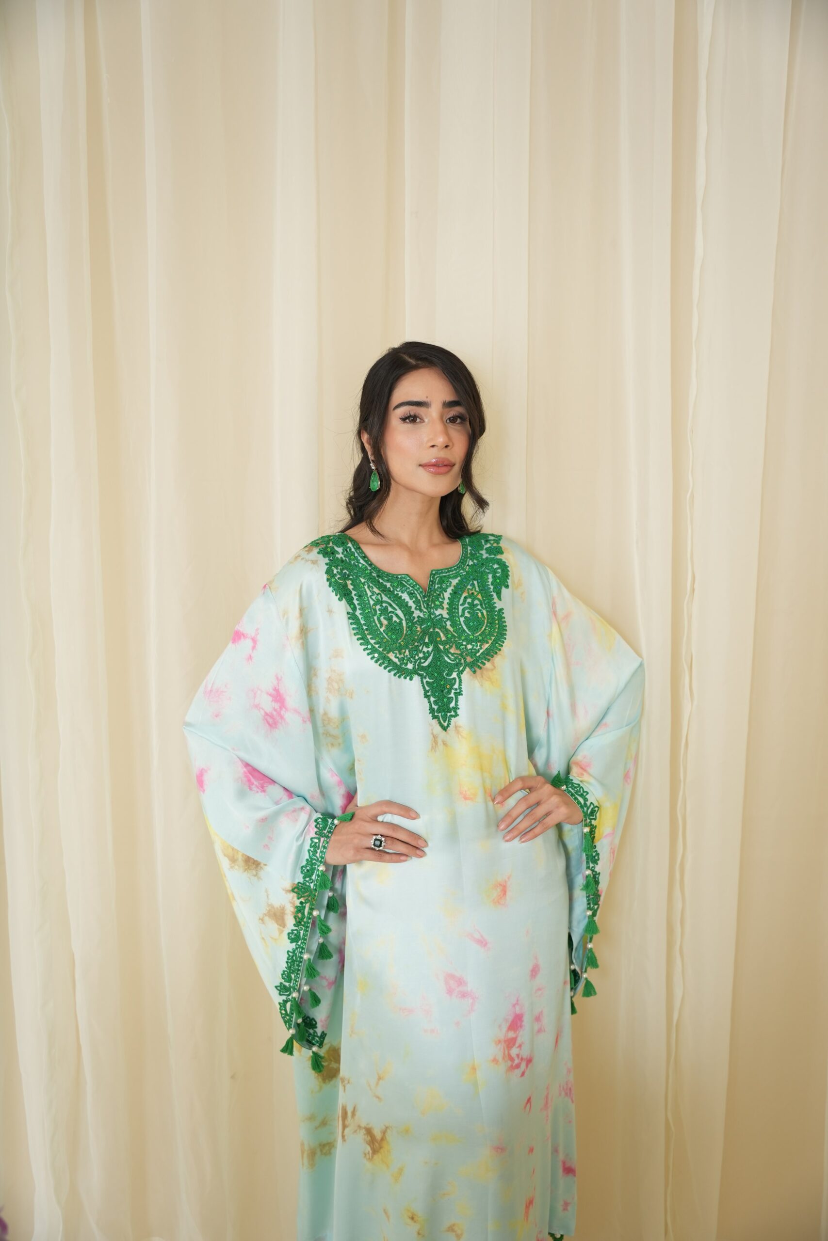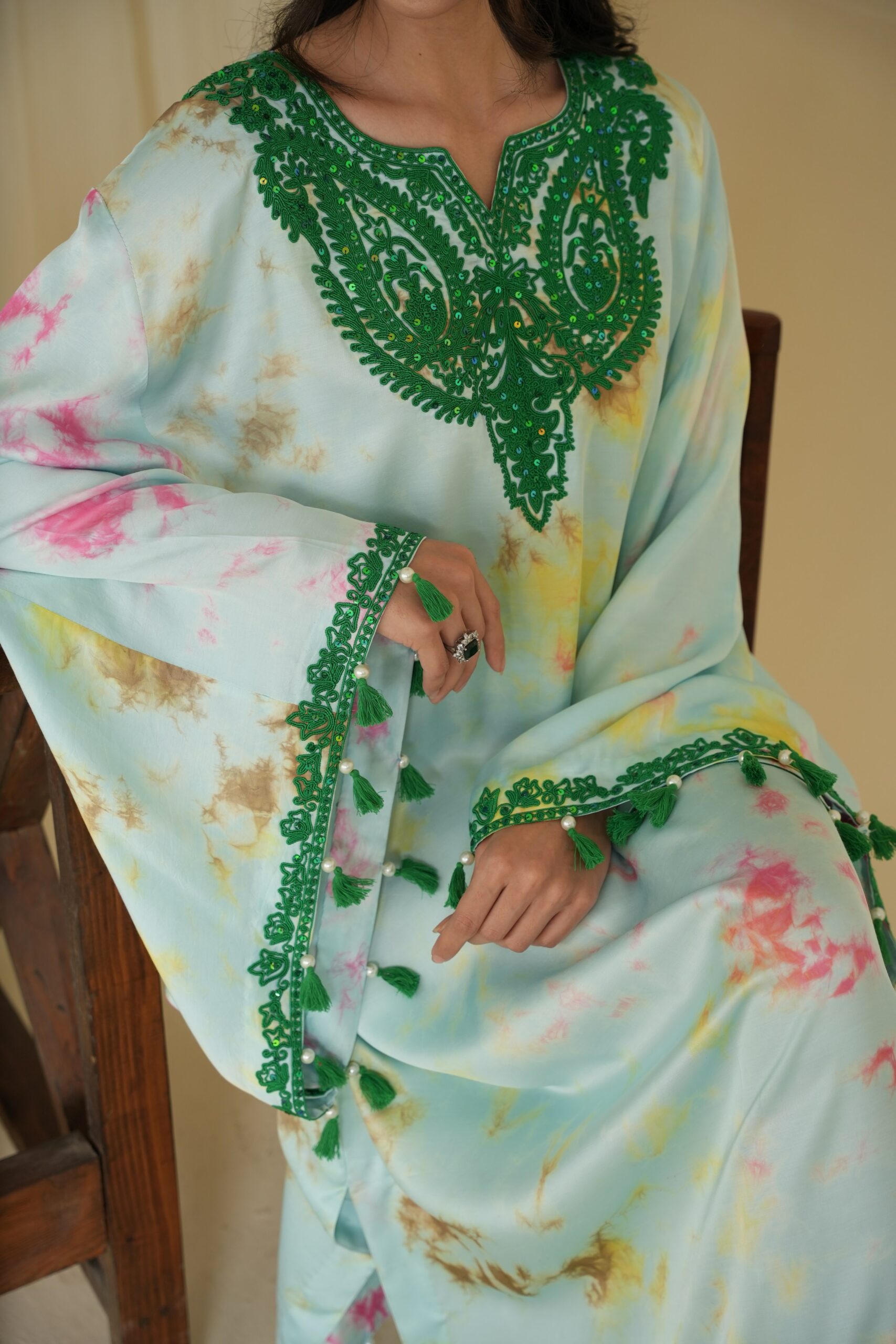 Breathable fabric distress dyed in 4 different hues of spring with intricate dori work in neons on the neckline and sleeves embellished with sequins. finished just right with handmade tassels and pearls for that walk to steal the show.