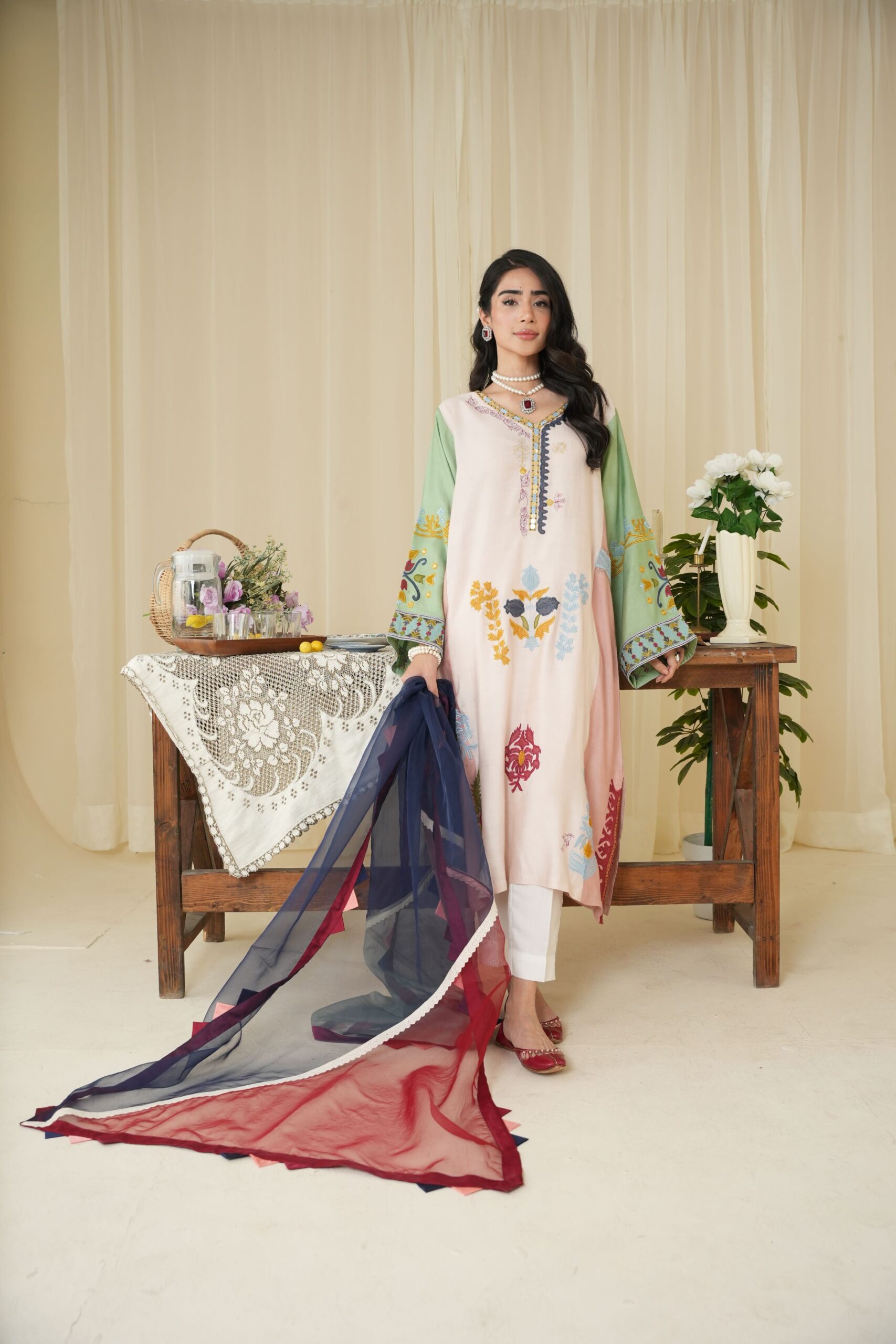 Made in a pure silk cotton net fit for the summer season. Intricately embroidered and appliqued (front, back and sleeves). Comes with organza dupatta patched in three colors, crochet laces and silk pyramids on all 4 sides of the dupatta.