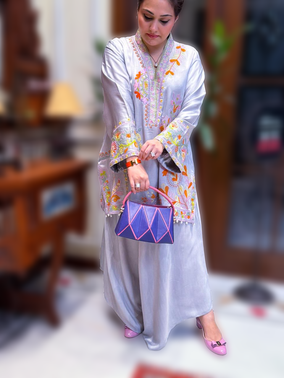 Crafted on pure cotton silk, this breezy shirt bursts with sweet and sour tones through vibrant appliqué and embroidery on both front and back, perfect for a summer party. Paired with a scalloped organza dupatta featuring corner motifs, and sleek cotton silk box pants for a complete, head-turning look.