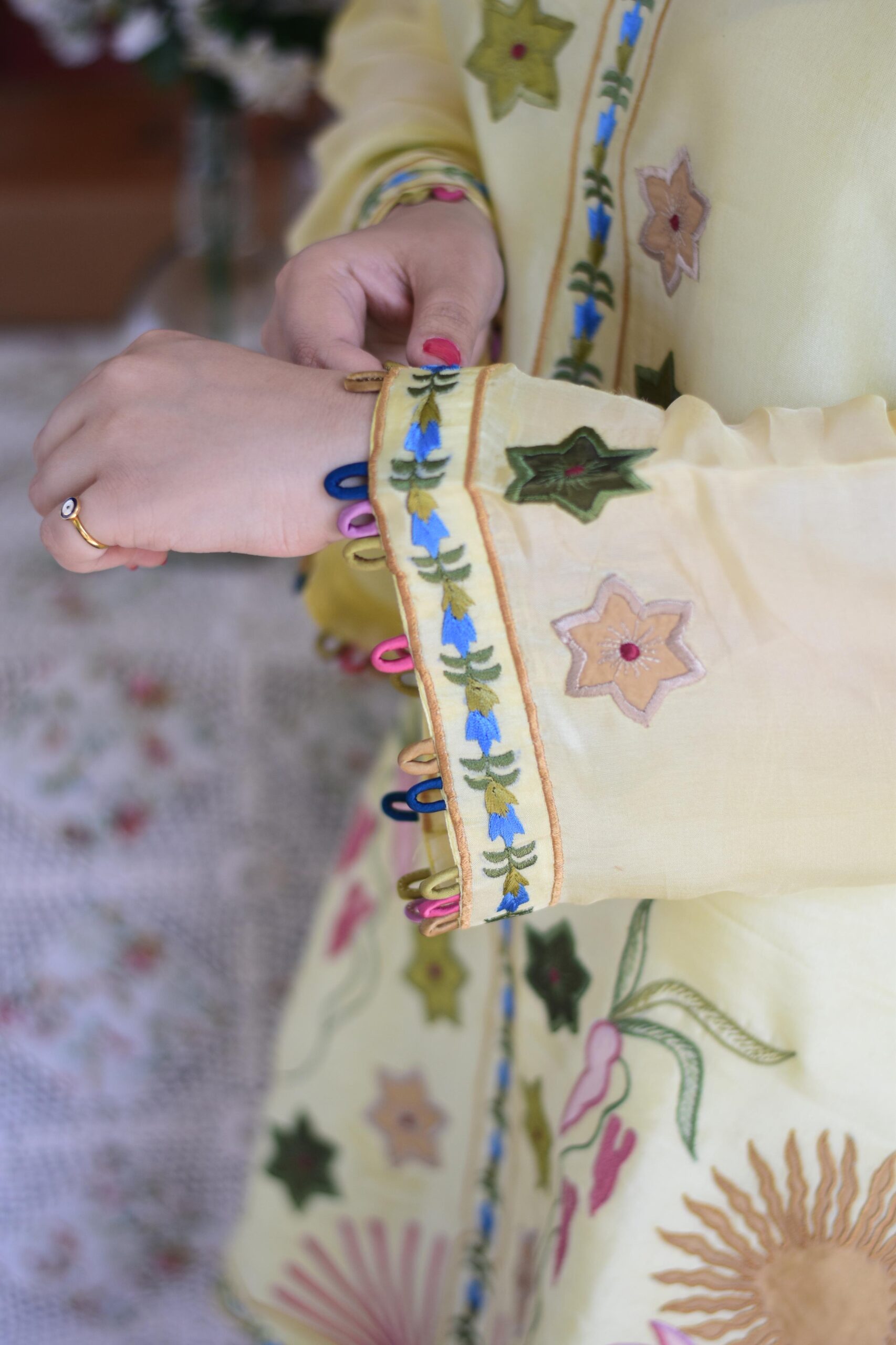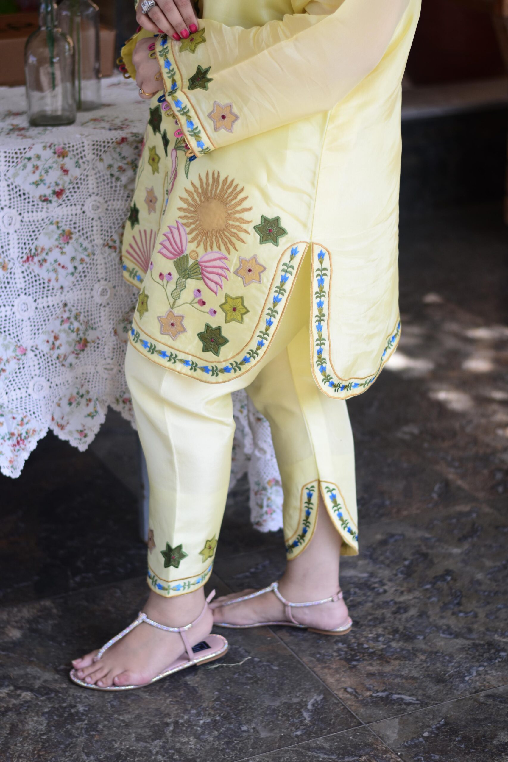 Crafted on tussel silk, this statement piece is rich with appliqué and embroidery along the short front, back hem, and sleeves. Paired with a beautifully tailored slit skinny shalwar, delicately embroidered to complete the look with flair.