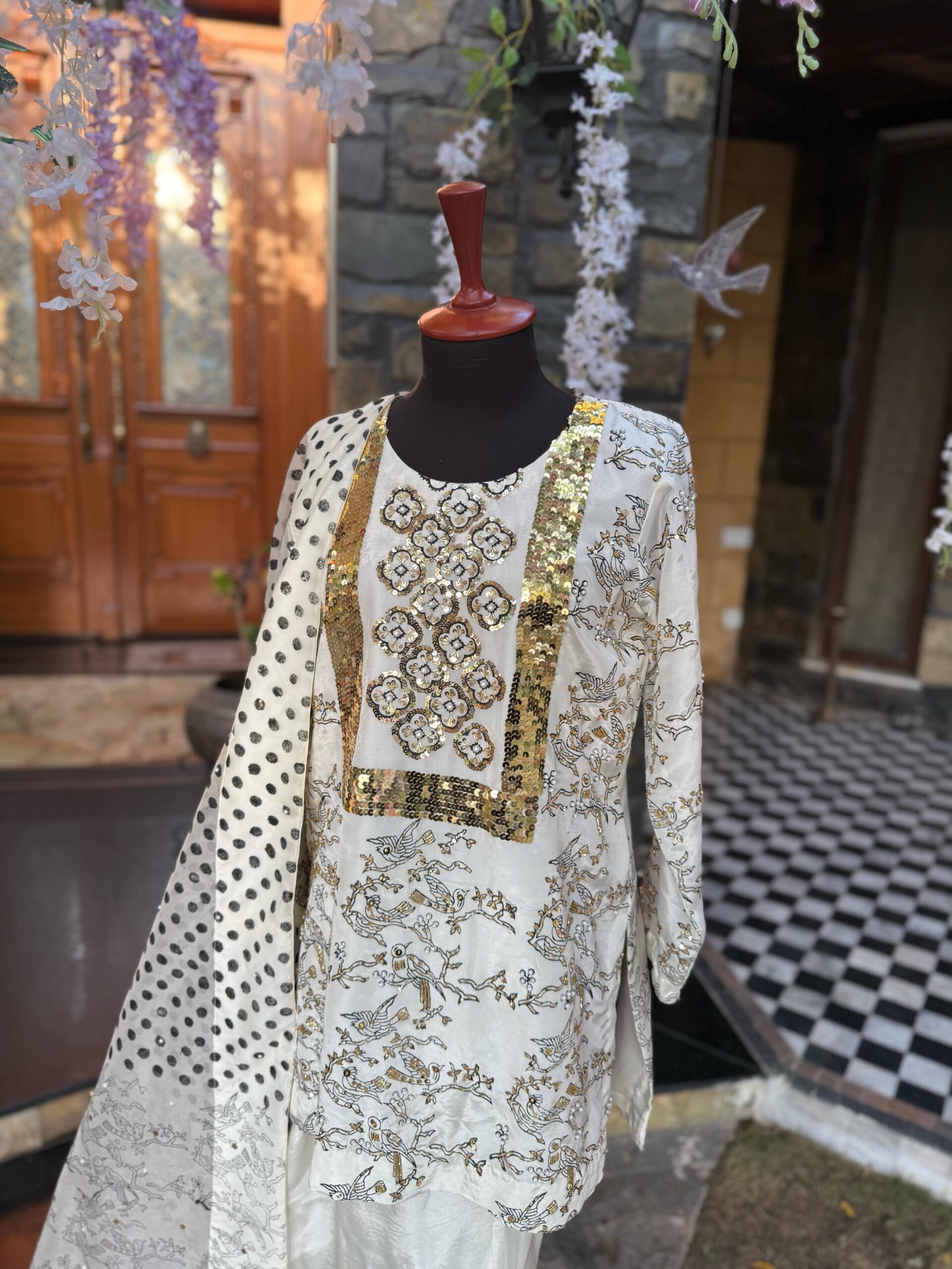 Made on pure tussle silk paired with an organza dupata, this article is perfect for any day. Short paired with a Farshi shalwar