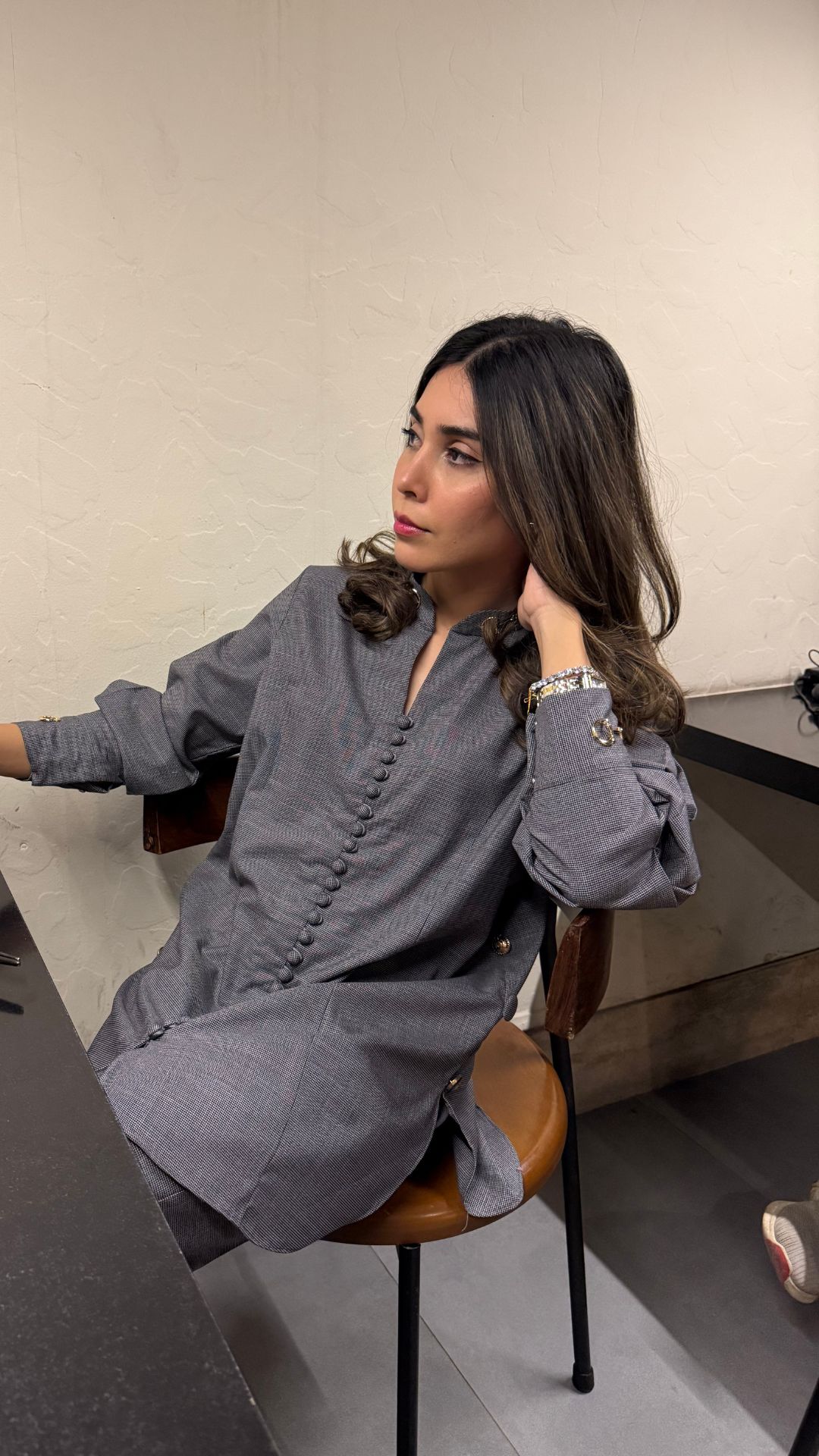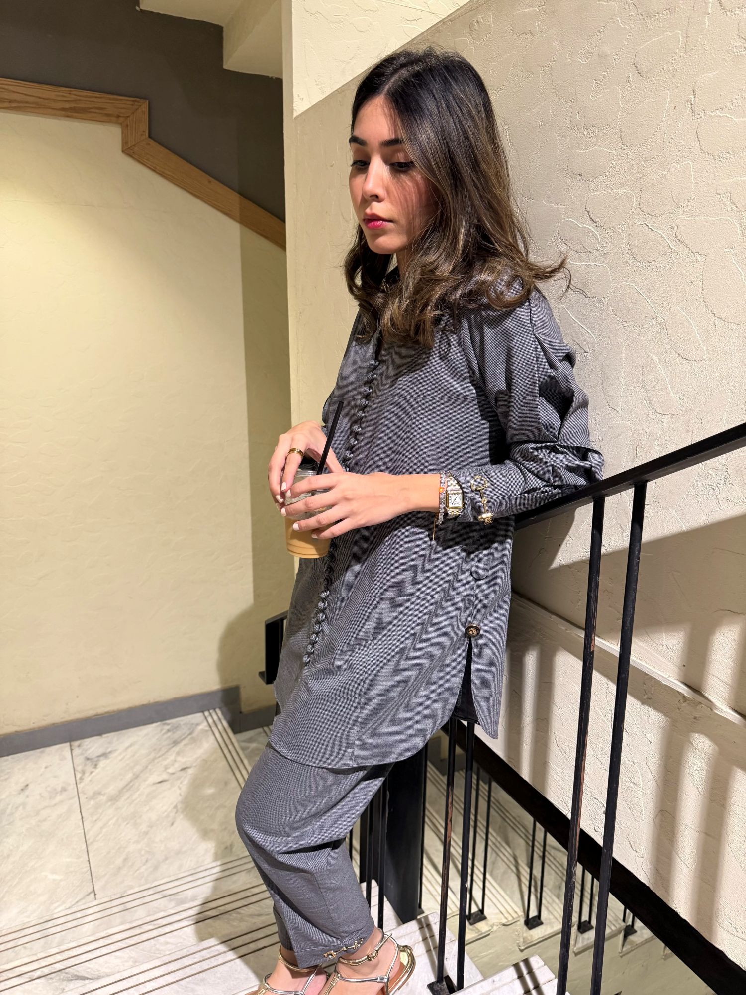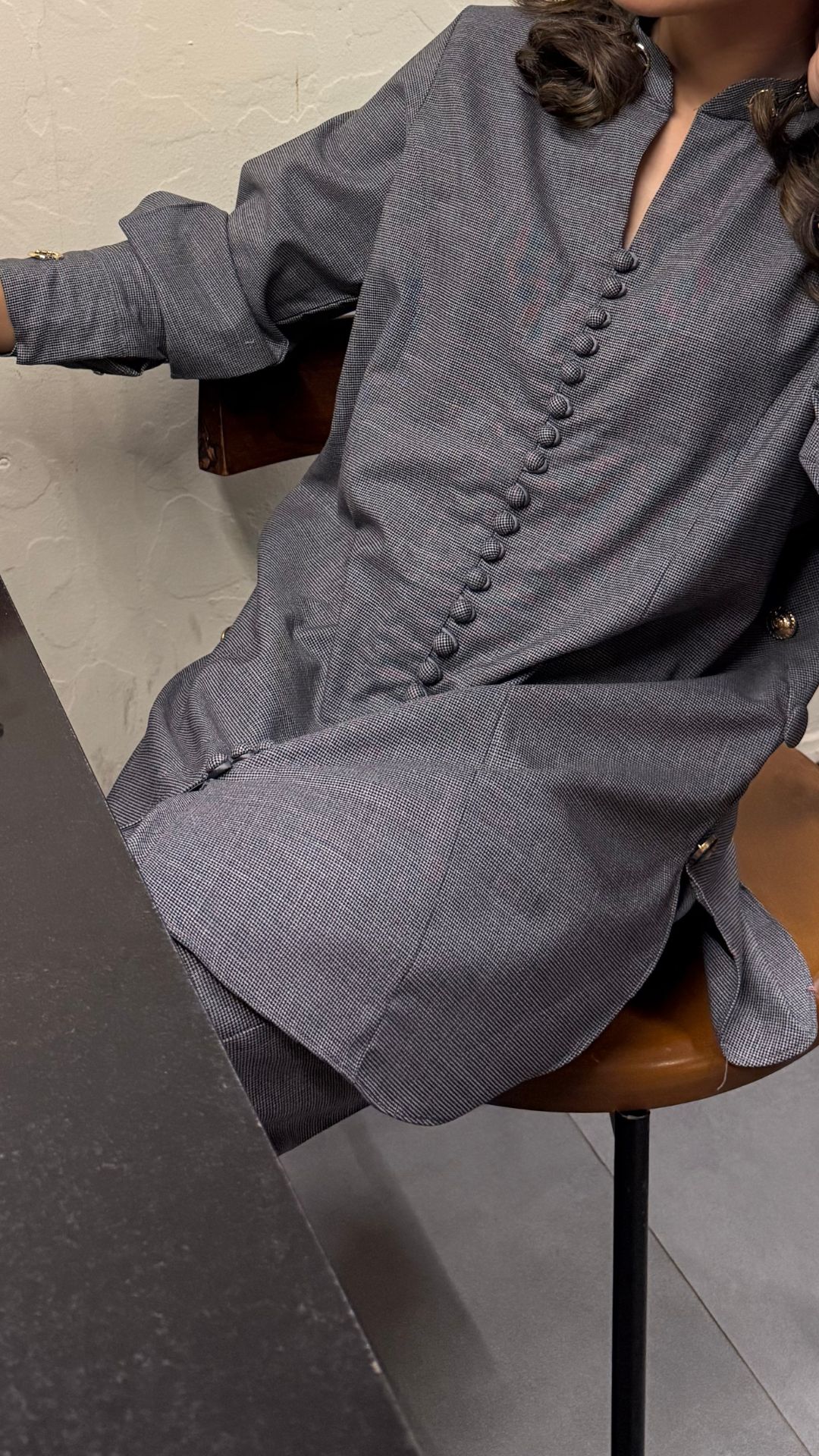 The CEO fit made in pure suiting fabric in queen cut with beautiful button and gold buckle details on the neck, sleeves and pants.